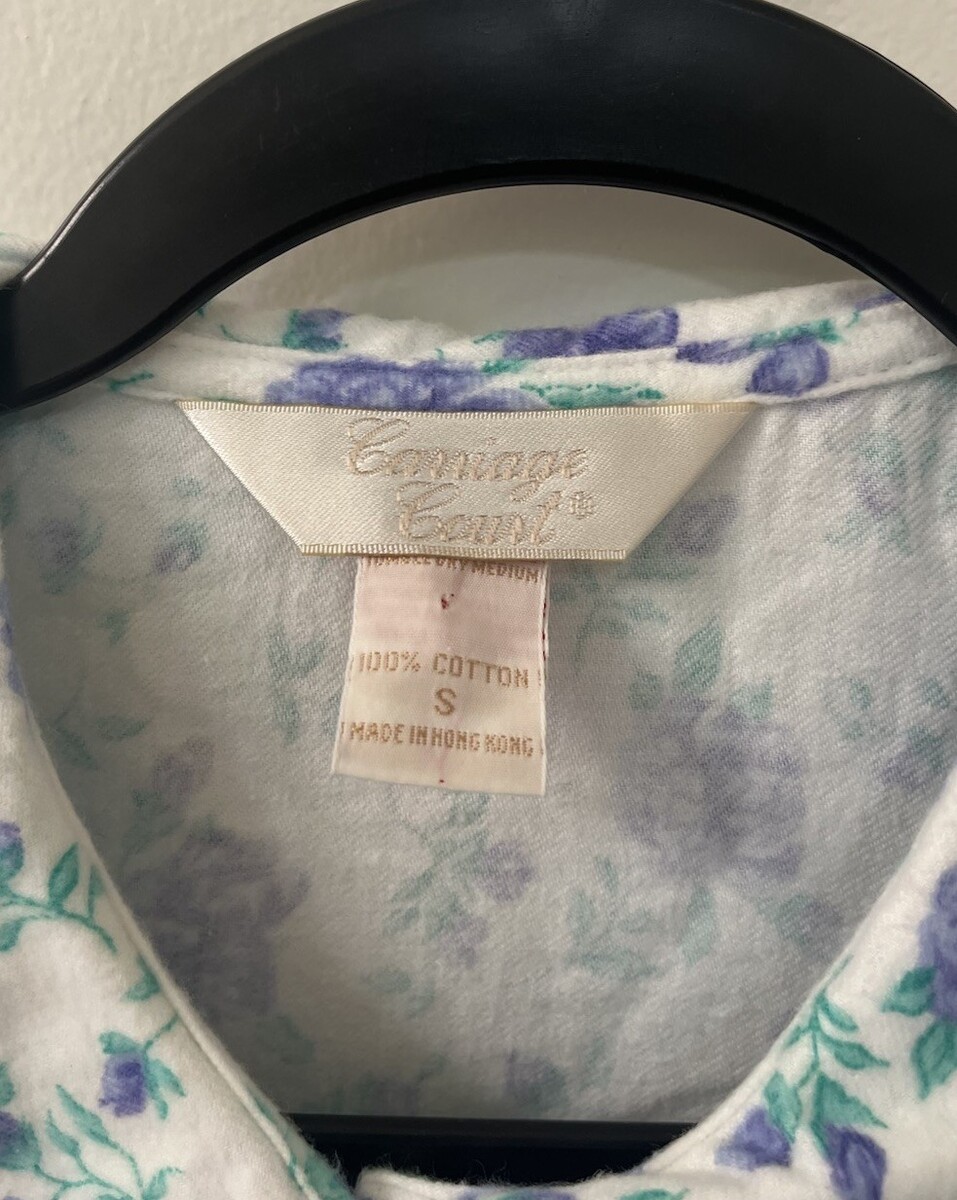 The product is a vintage Carriage Court housecoat in a size small, featuring a floral pattern with snap front closure. It has 3/4 sleeves and is suitable for women looking for a cottagecore style robe. The white color and floral pattern are feminine and stylish. Perfect for lounging around the house in a comfortable and cozy manner. Please let me know if you have any questions!