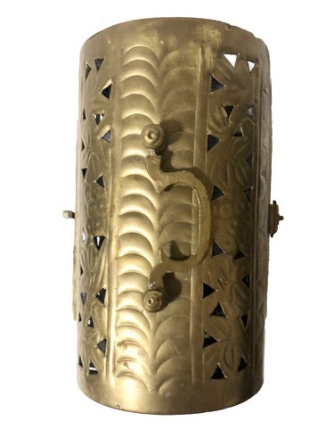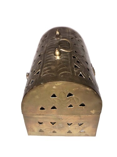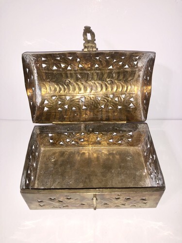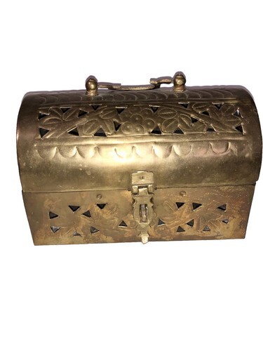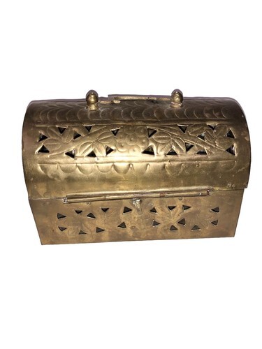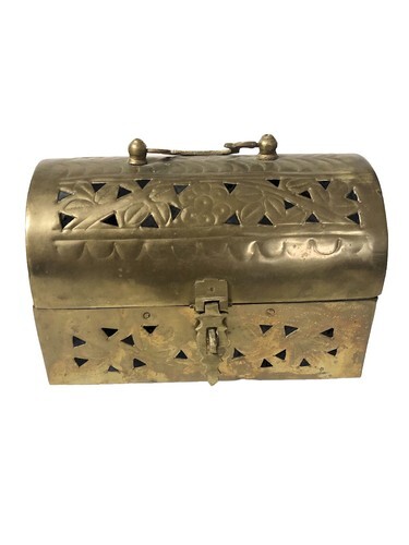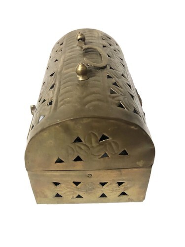 The Vintage Brass rectangle footed Cricket Box is a unique and charming treasure trinket box made of brass, originating from India. With a handle for easy carrying, and the reticulated design, this box can be used to store jewelry, trinkets, potpourri, or incense, adding a touch of vintage elegance to any space. Its craftsmanship and design make it a functional and decorative piece for collectors or those looking to add a touch of Indian flair to their home decor.