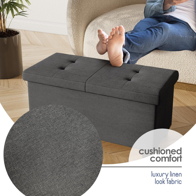 REMOVABLE LEGS: Our ottoman storage bench for bedroom and kids? room can fold flat when not in use and measures 30? L x 15" D x 15? H when fully expanded. Adjust the height by adding or removing sturdy legs, adapting this gray ottoman to suit your storage needs.