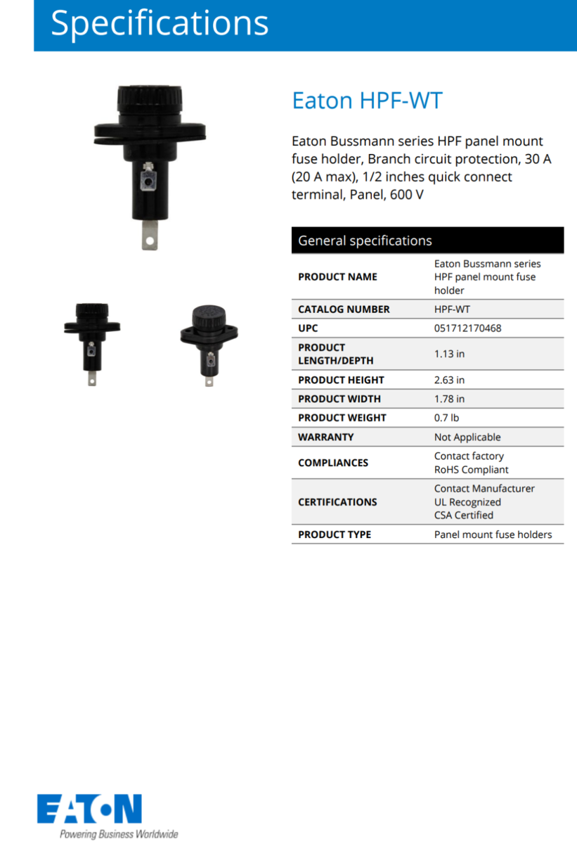 1X HPF-WT Bussmann Panel Mount Fuse Holder and similar items