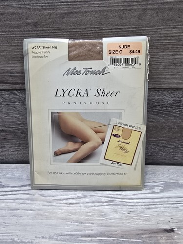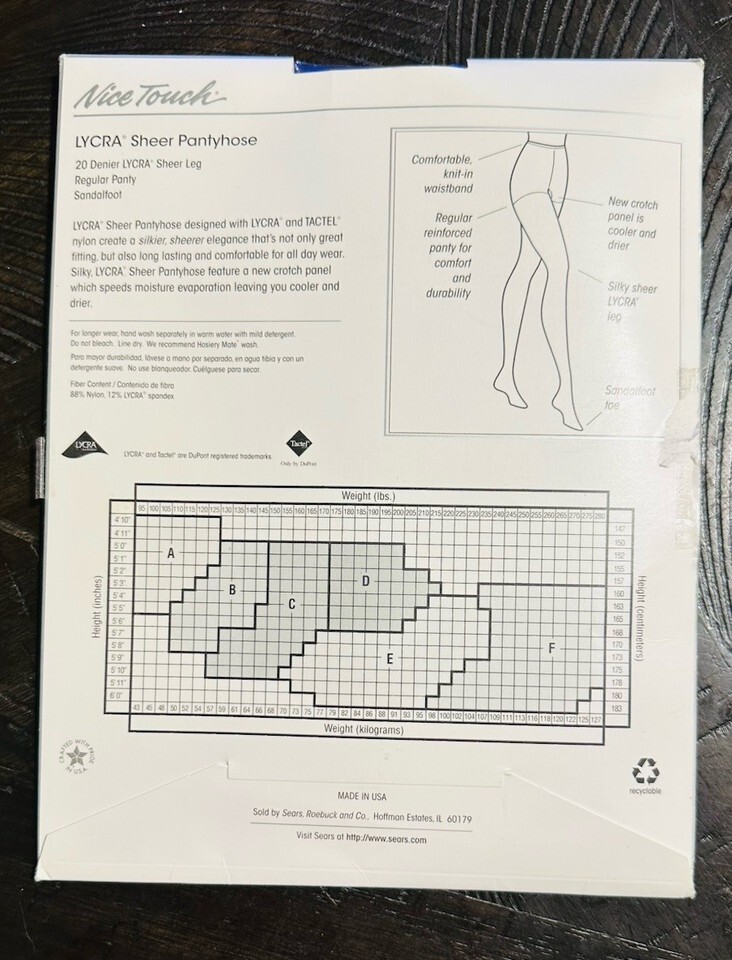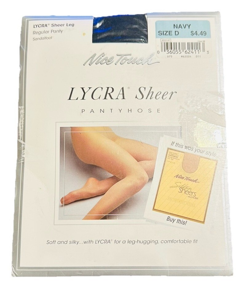 Nice Touch Lycra sheer leg pantyhose with sandalfoot and regular panty. Color Navy, Size D. Vintage and rare old stock hosiery, perfect for collectors or for adding a classy finishing touch to your outfit.