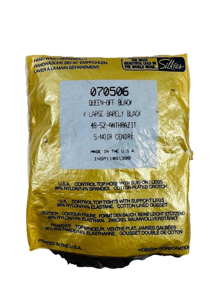 silkies pantyhose, control top hosiery, queen xl pantyhose, off black support legs, barley blk hosiery, vintage silkies, new sealed pantyhose, retro hosiery collection, classic control top nylons, women?s support pantyhose
