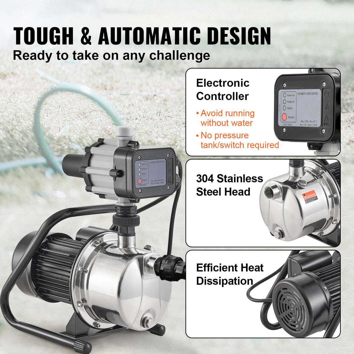 1HP Powerful Garden Pump: Max Pressure: 87 psi; Max Suction: 26.2 ft. This shallow well pump has a powerful 1HP motor, providing 23 GPM max flow and 145 ft max head. The pump can boost home water pressure with an electronic controller to ensure automatic work and prevent dry running. Whether you're in the shower or using the faucet, this powerful pressure booster will keep your water pressure going strong.
