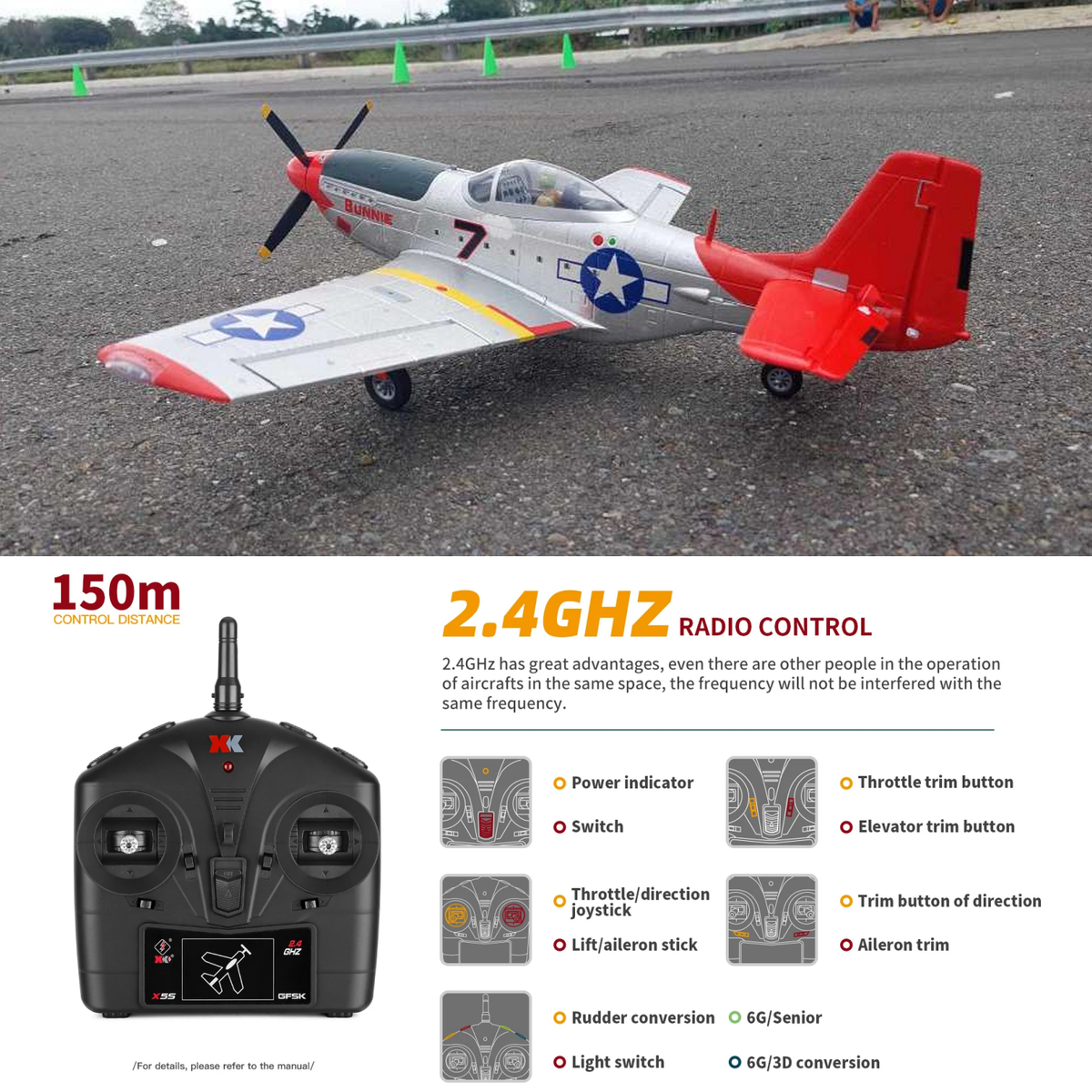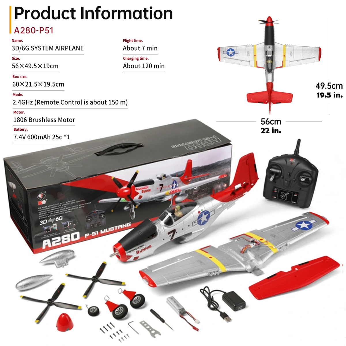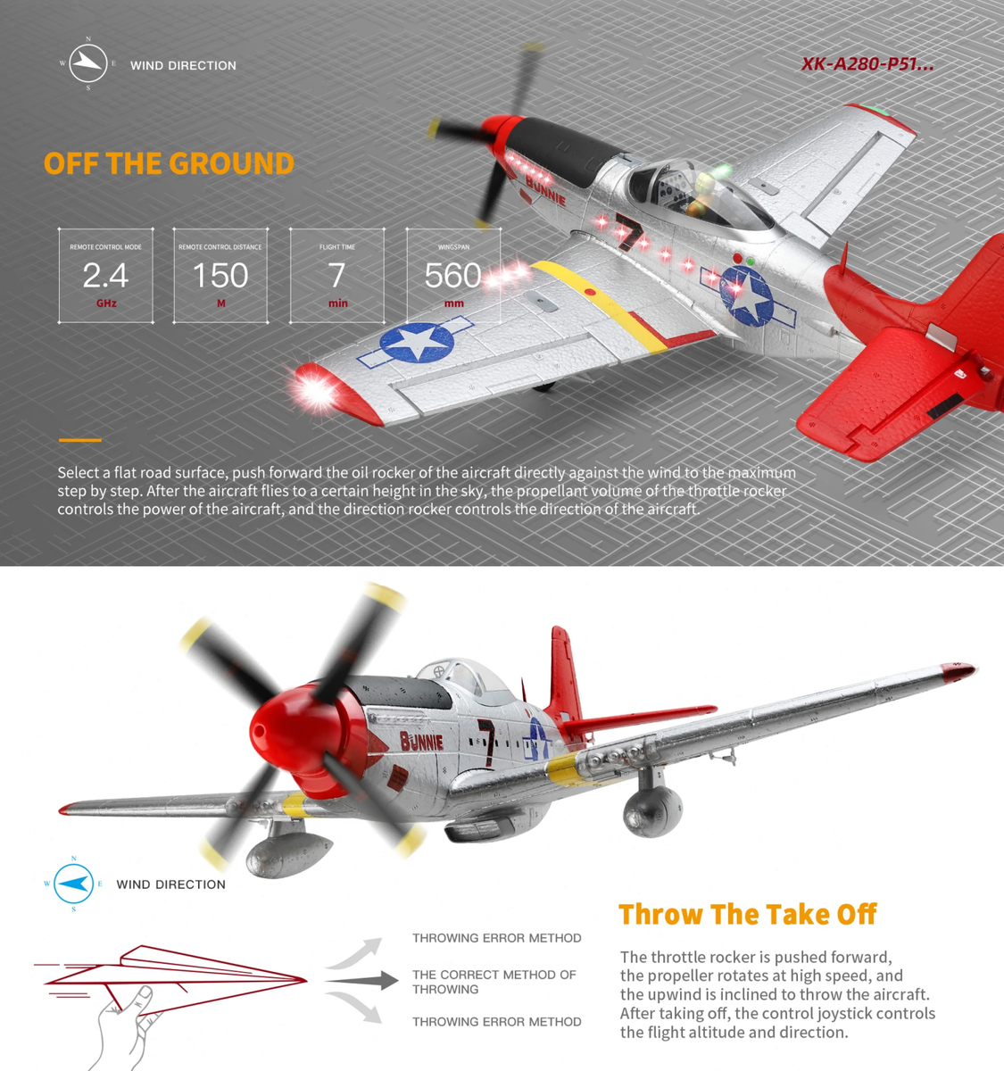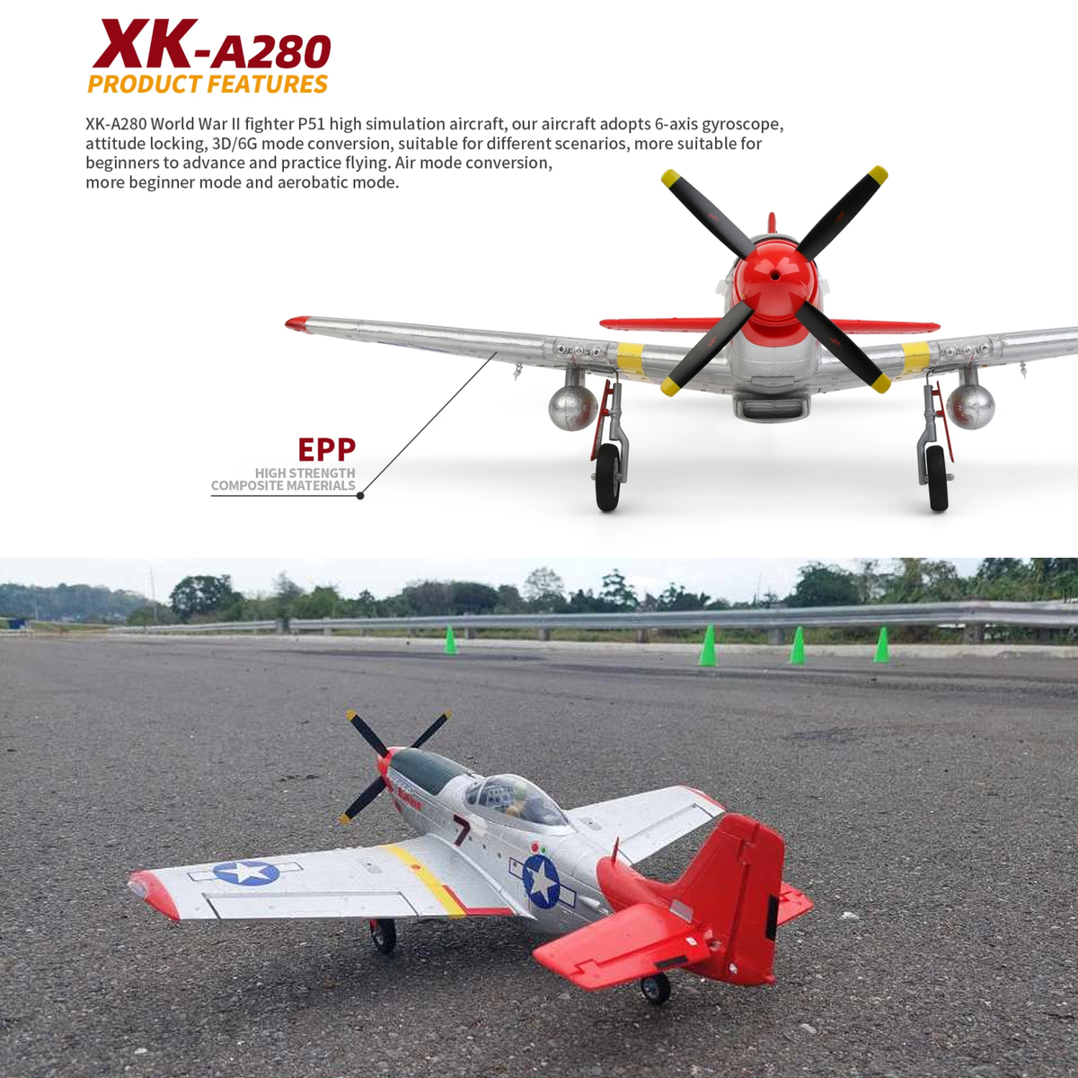 XK-A280 World War II fighter P51 high simulation aircraft, it adopts 6-axis gyroscope,attitude locking, 3D/6G mode conversion, suitable for different scenarios, more suitable for beginners to advance and practice flying. Air mode conversion, more beginner mode and aerobatic mode.