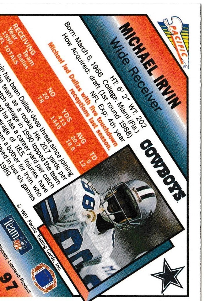 1991 Pacific Michael Irvin #97 Football Card Dallas Cowboys