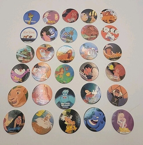 Pogs are in vintage used condition. Lion King is in overall good condition, but Snoopy shows some signs of being played with.