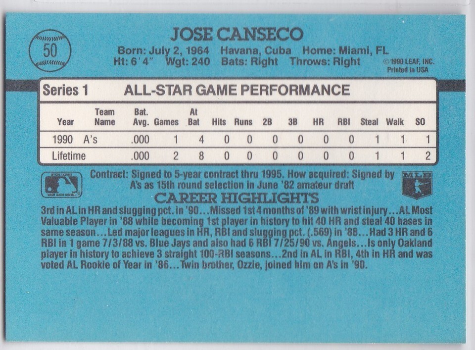 M) 1991 Donruss Baseball Trading Card - Jose Canseco #50