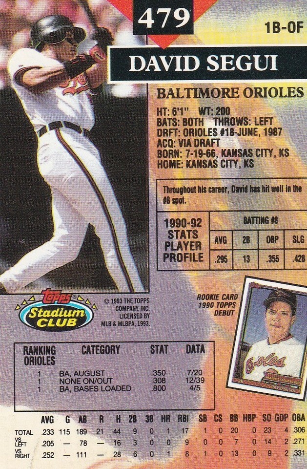 1993 Topps Stadium Club Baseball Trading Card - David Segui Baltimore Orioles(M)