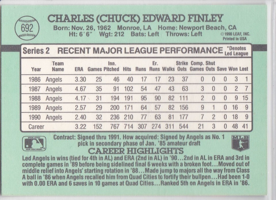 M) 1991 Donruss Baseball Trading Card - Chuck Finley #692