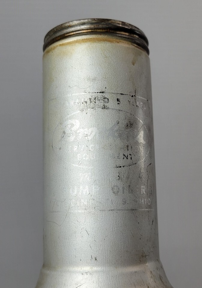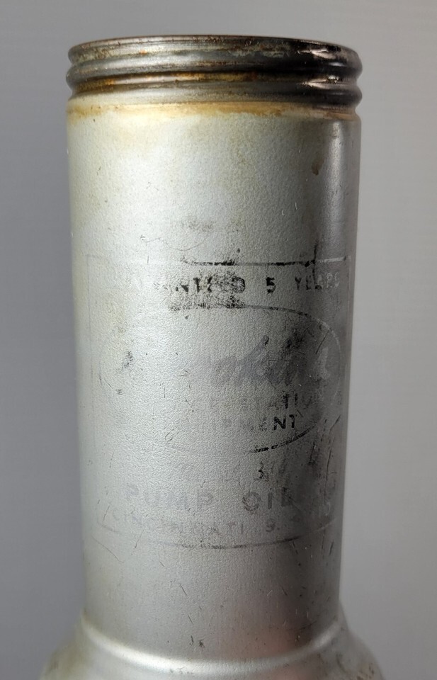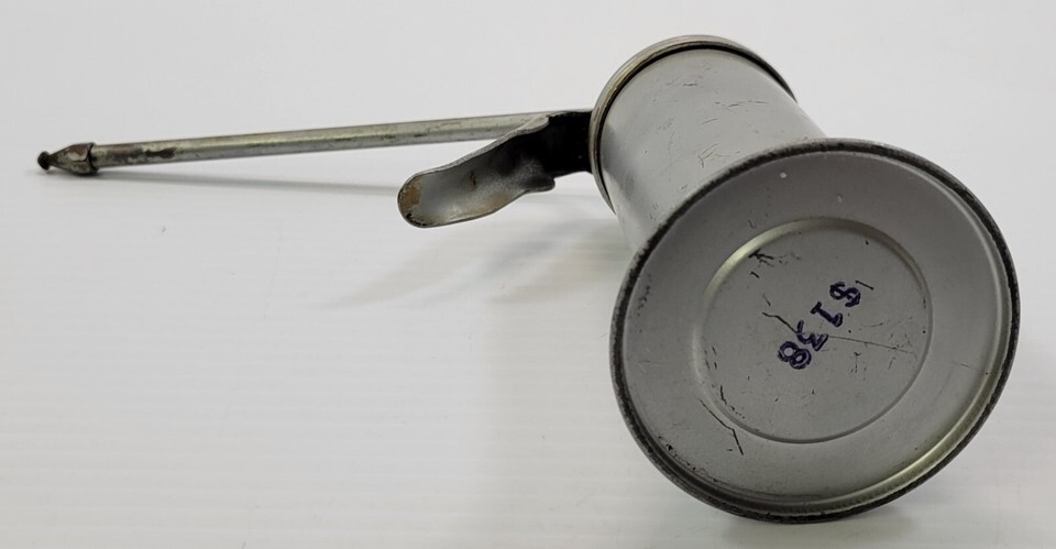 Oil can is old vintage used shop equipment with signs of age, use and years of storage including scuffs, marks, dings and dents. The advertising print has faded significantly and only seen under lights at an angle. It was wiped down and empty, but may still have oil residue from use.