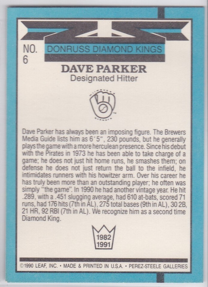 M) 1991 Donruss Baseball Trading Card - Dave Parker #6