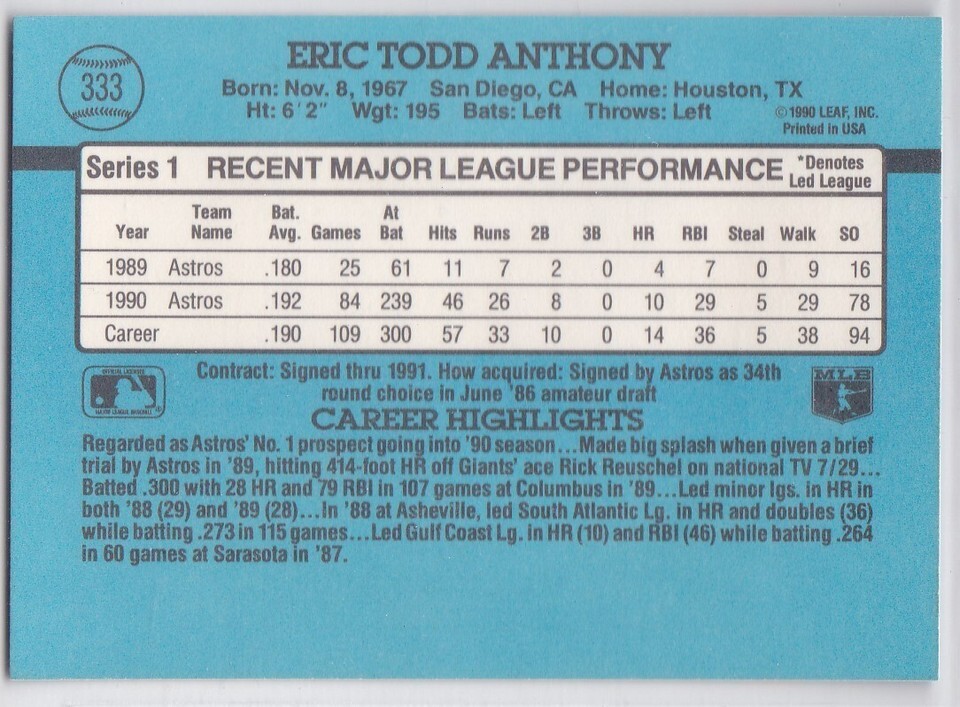 M) 1991 Donruss Baseball Trading Card - Eric Anthony #333