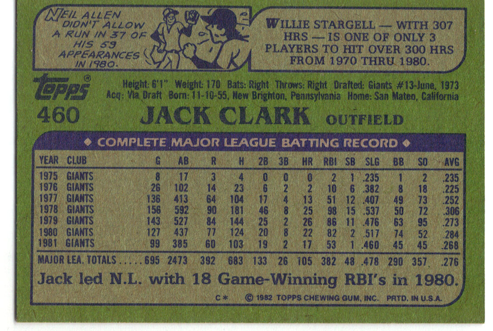 1982 Topps Jack Clark San Francisco Giants #460 Baseball Card