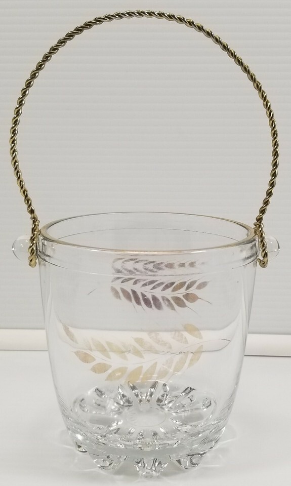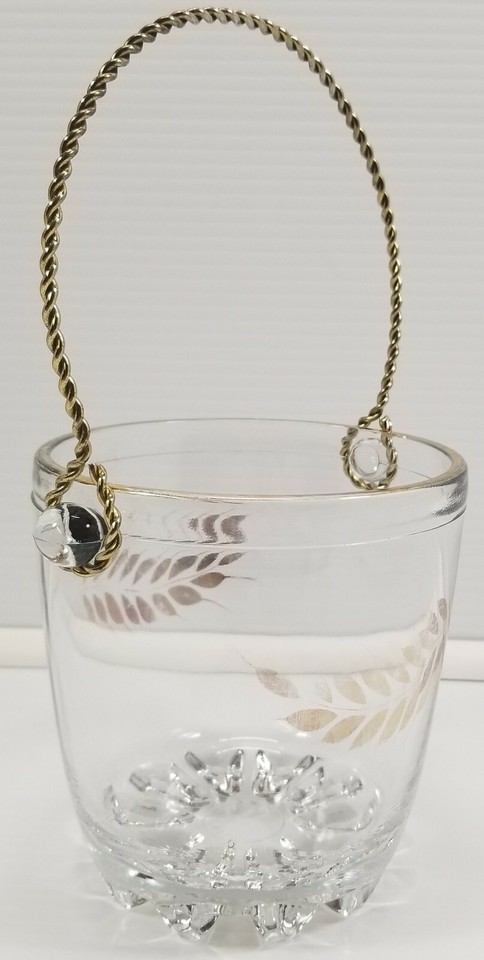 I) Gold Tone Glass Ice Bucket with Gold Braided Rope Handle Floral Leaf Design