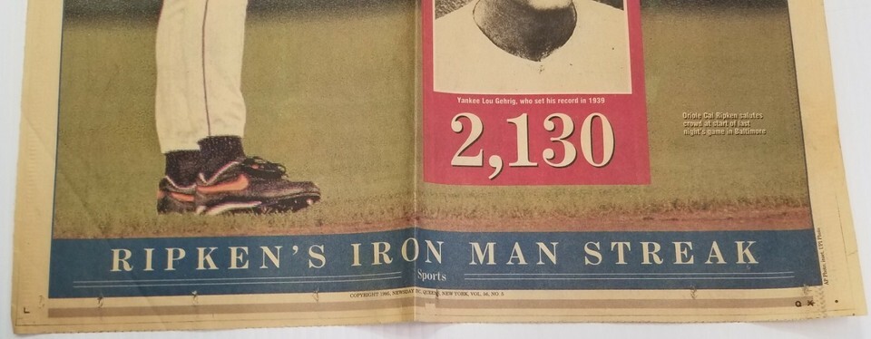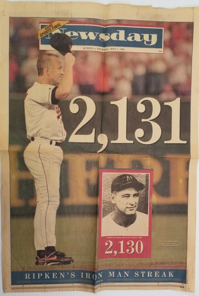 N) Vintage September 7, 1995 Newsday Paper Cal Ripken Jr. Streak Cover Poster