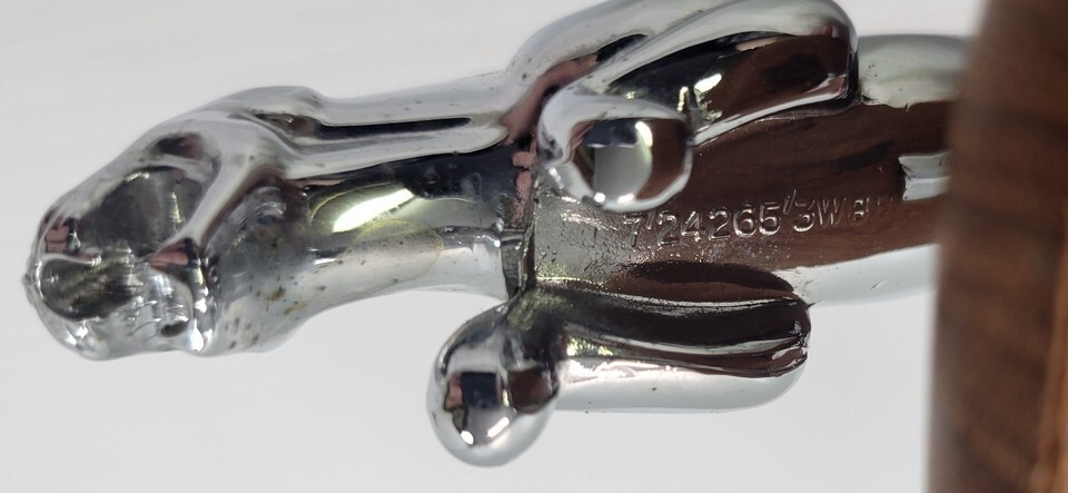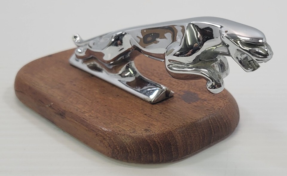 *B2) Vintage Leaping Jaguar Cat OEM Metal Hood Ornament Wooden Base 7242653WBB