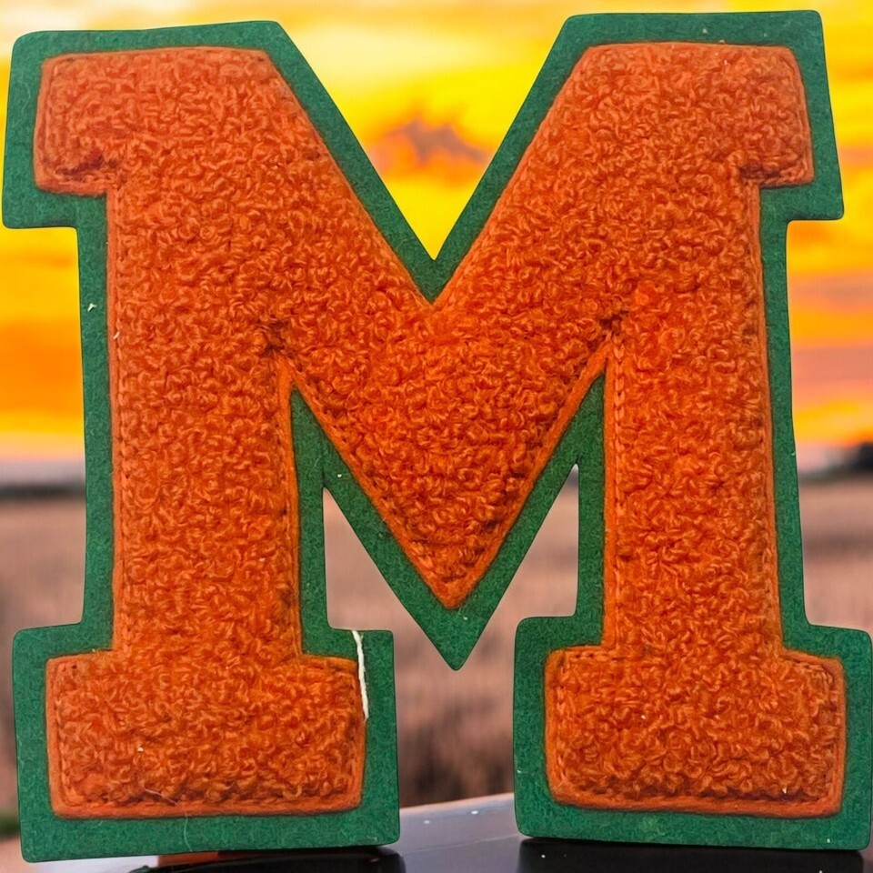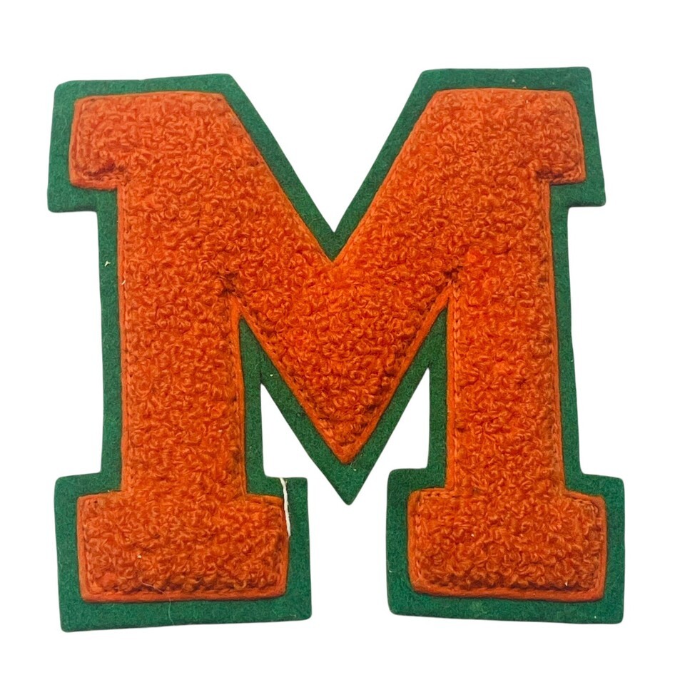 This vintage 1950's varsity letterman jacket patch features the letter "M" in orange and black, representing Neff Athletics. The patch is an original piece, not a reproduction, and was made in the United States. It is a nostalgic memorabilia item from the past, perfect for collectors of vintage sports memorabilia. The patch signifies a sense of tradition and school spirit, harkening back to the classic style of varsity jackets from this era.