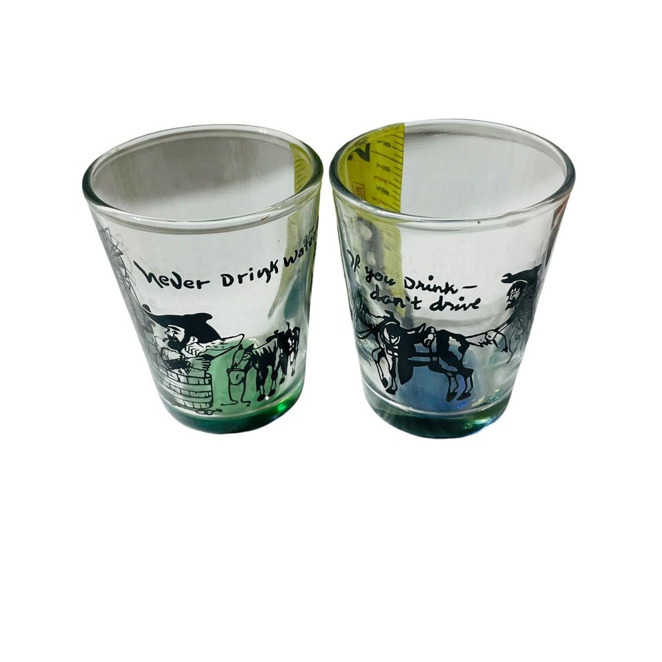 The shot glasses are from the 1950s and are an original, licensed reproduction. They are perfect for all occasions, including marriage and drinking-themed parties. The glasses should be hand-washed only and come with a decorative base. This set is a great souvenir for those who love vintage barware.