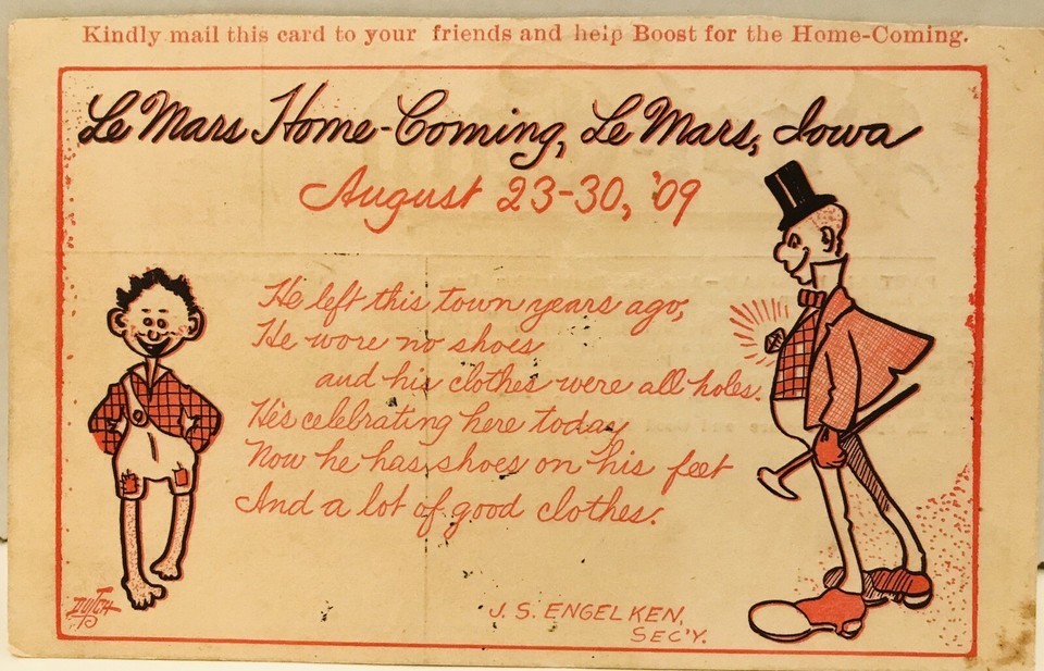 Le Mars, Iowa 1909 Homecoming Impression Barefoot Man Top Hat Poem Post Card