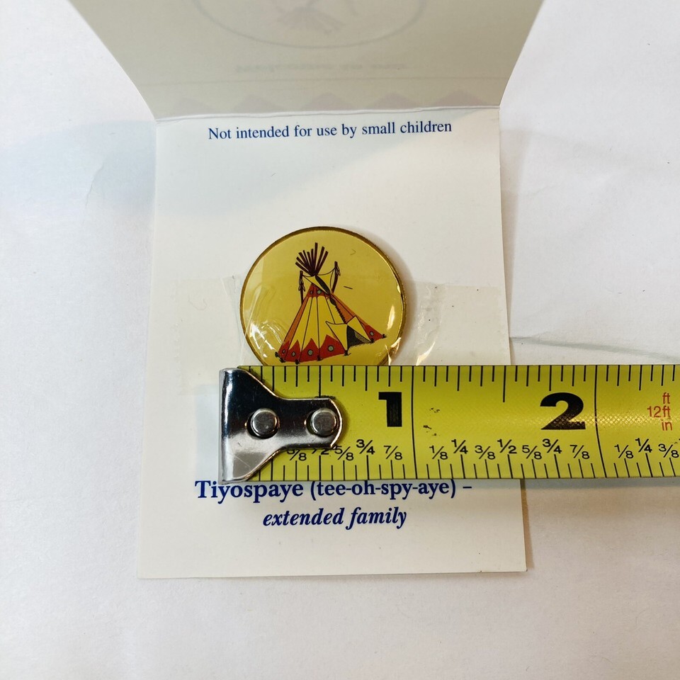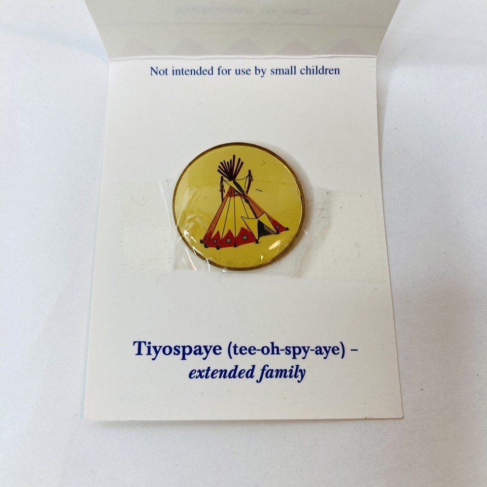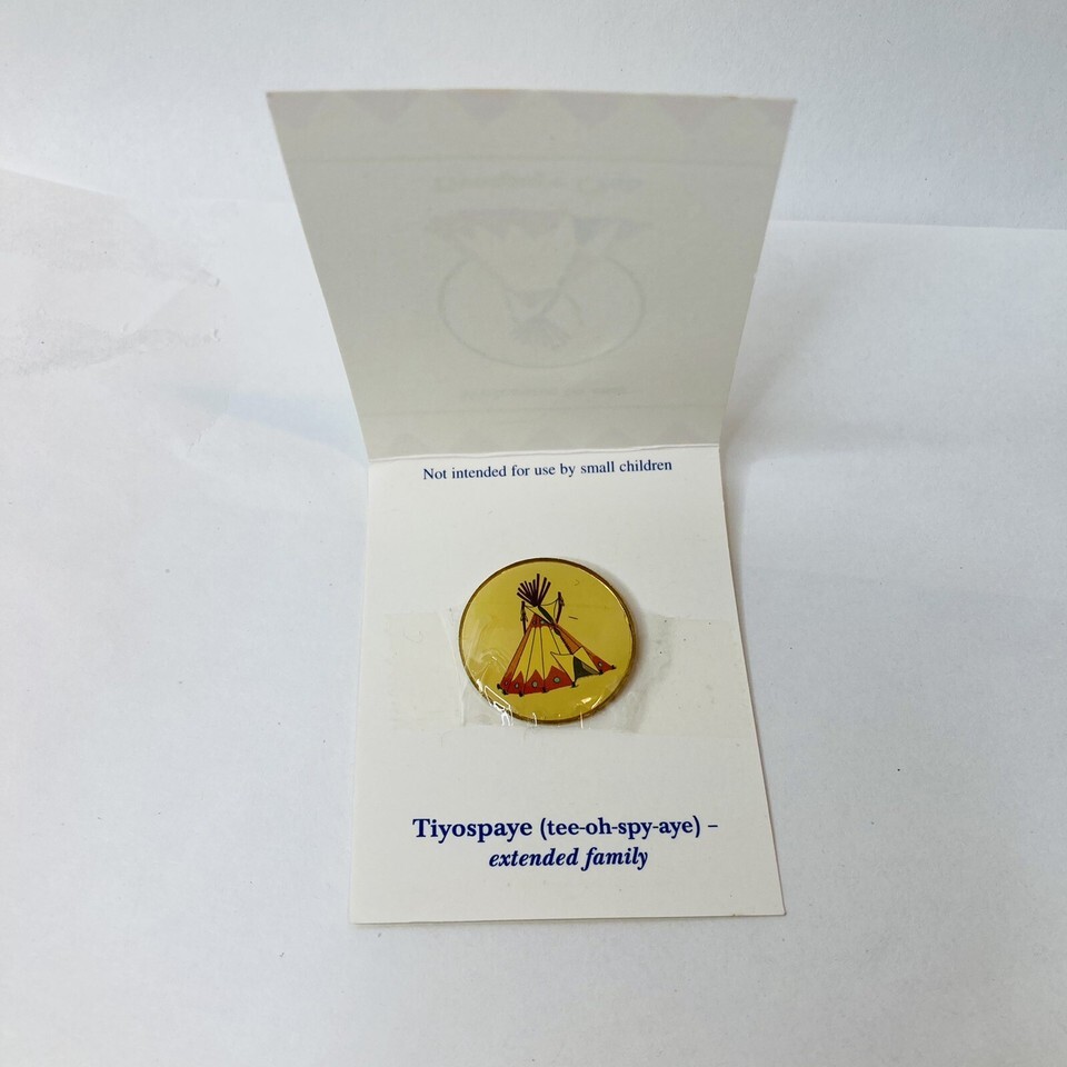 Nice little souvenir pin from St Joseph?s Indian School. Small enamel pin on card ?Welcome to our Tiyospaye Club?. Inside card explains Tiyospaye (tee-oh-spy-aye) extended family.
