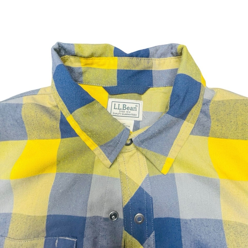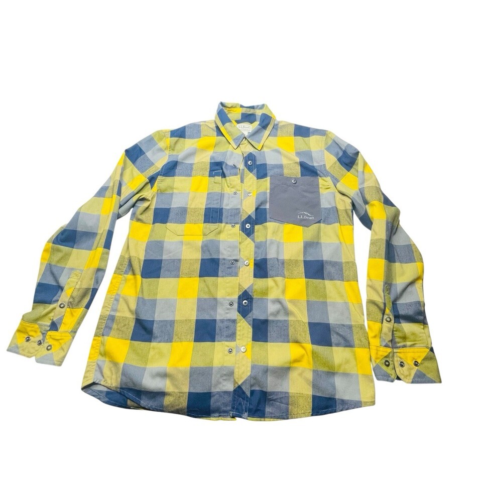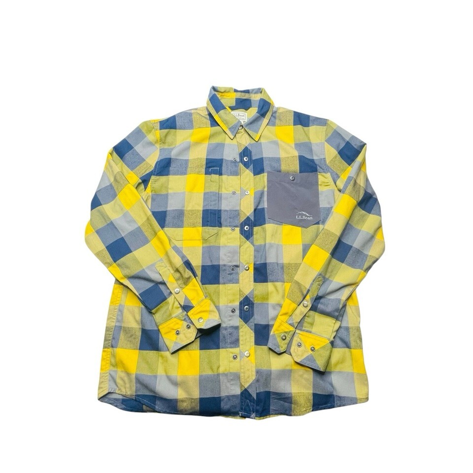 LL Bean Button Up Snap Long Sleeve Shirt Men’s M Yellow Blue Plaid Logo Pocket