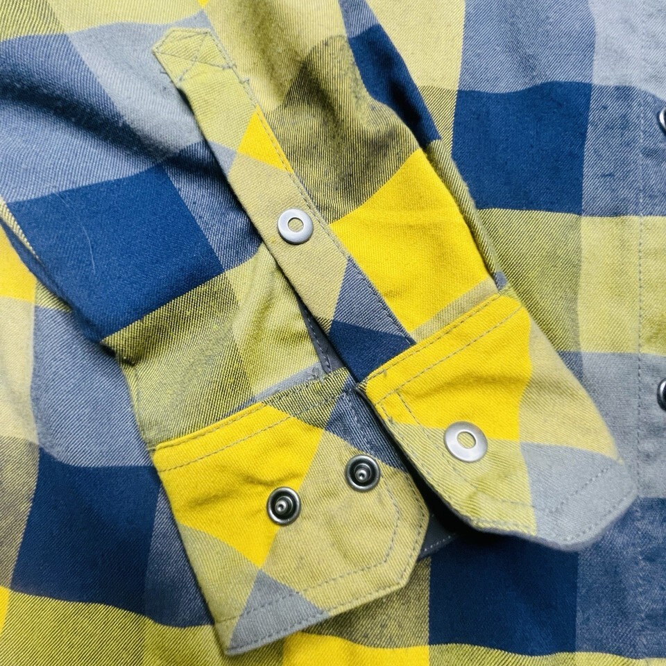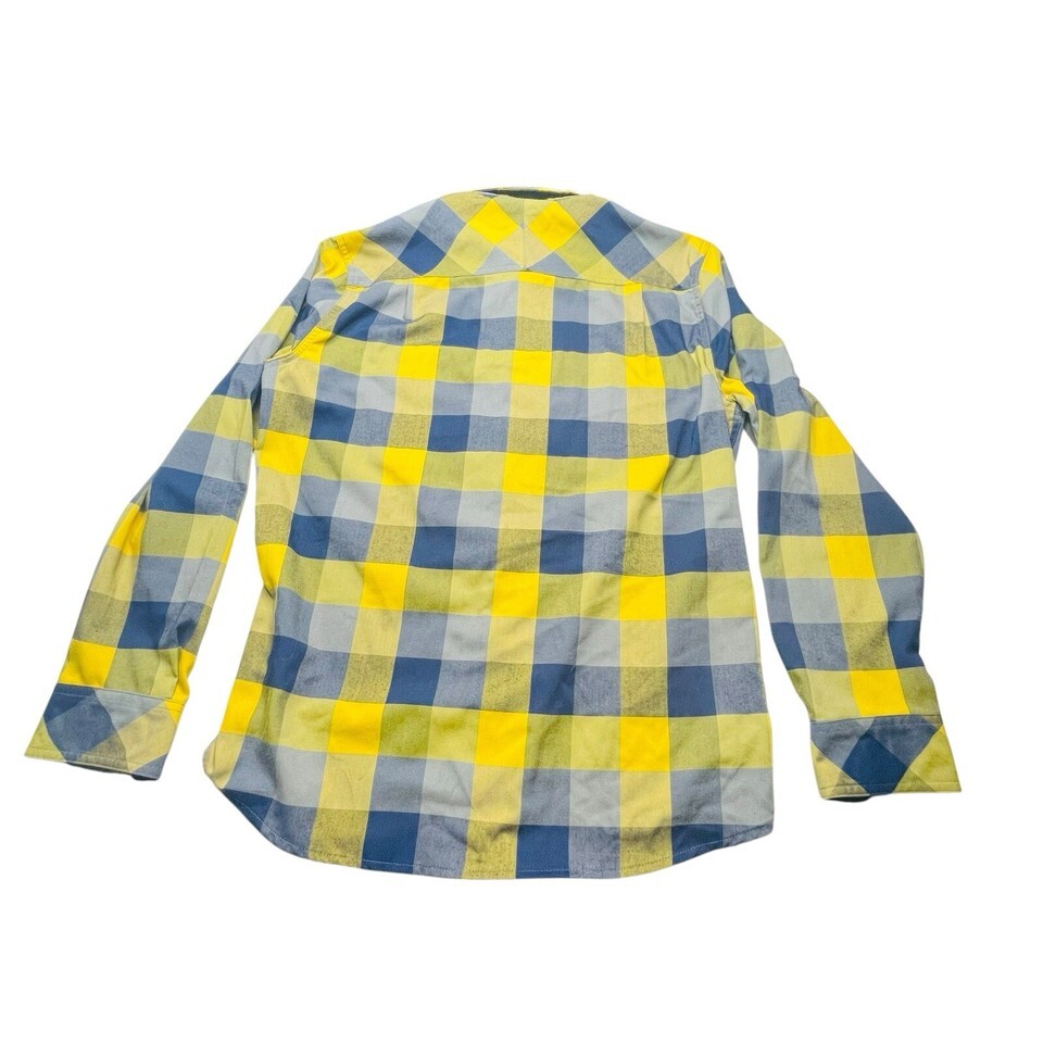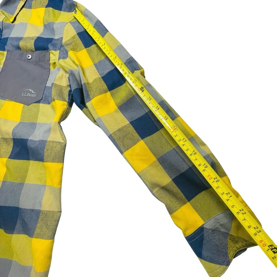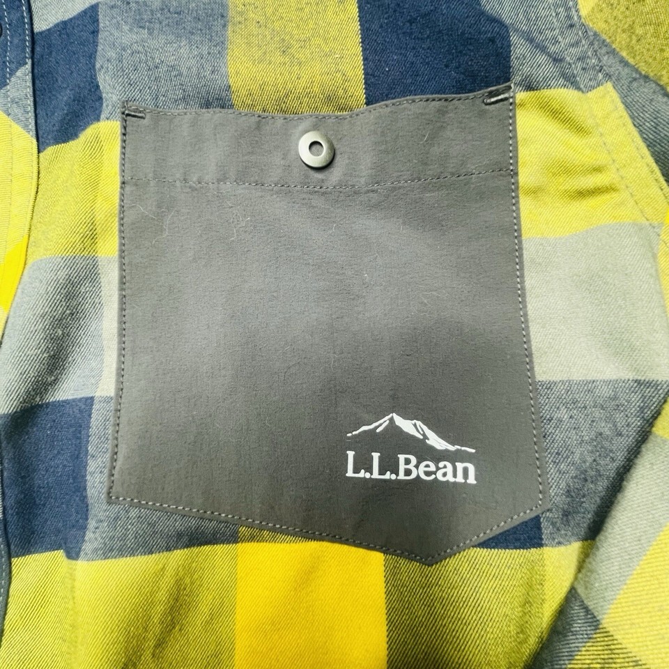 LL Bean Button Up Snap Long Sleeve Shirt Men’s M Yellow Blue Plaid Logo Pocket