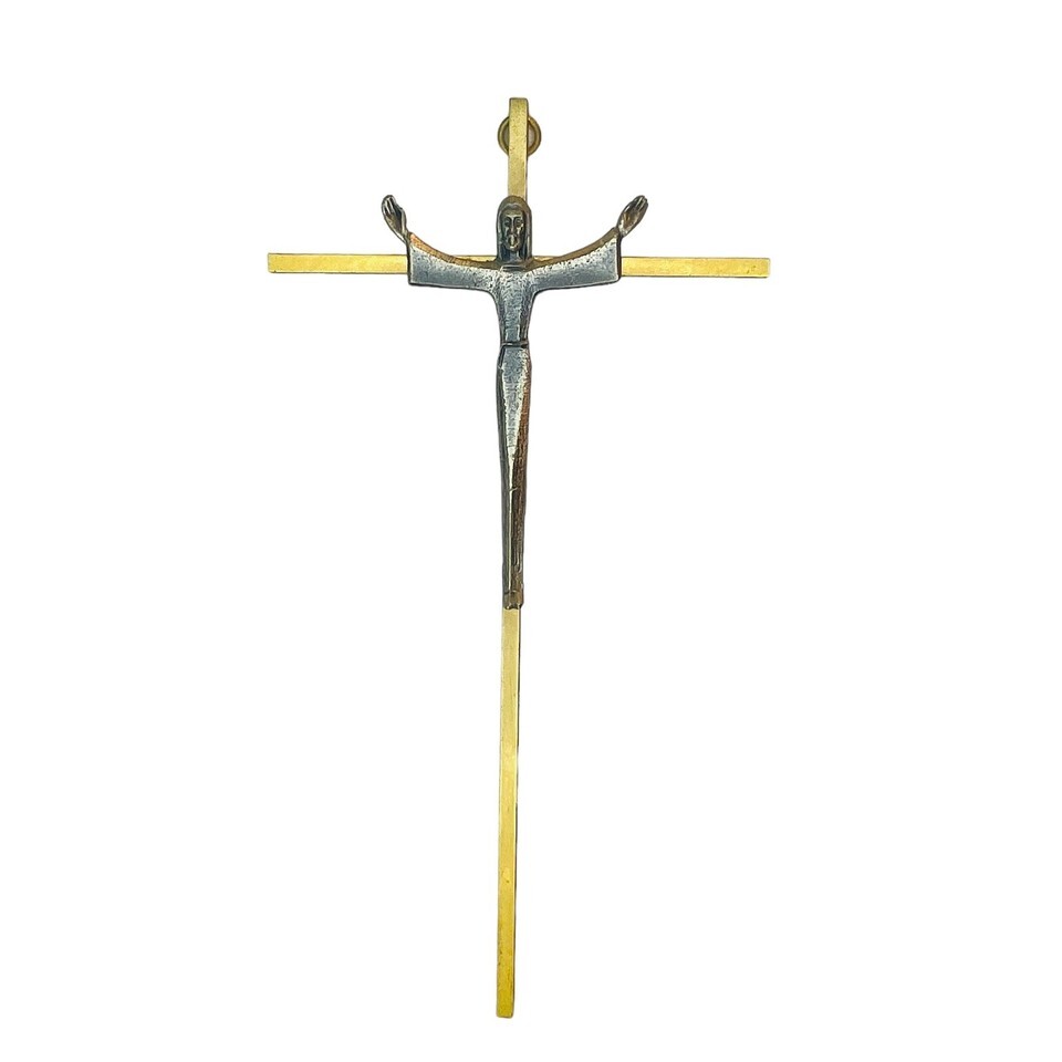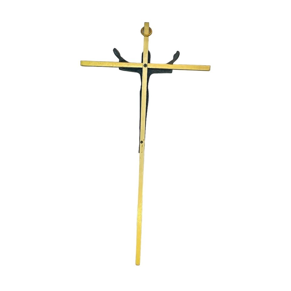 This vintage brass metal crucifix is a stunning addition to any collection. With a length of 10 inches, it is the perfect size to be hung on a wall and will instantly add a touch of mid-century modern style to any room. The intricate design features Jesus on the cross and is sure to be a conversation starter. Made from durable brass, this piece is built to last and will be a treasured item for years to come.
