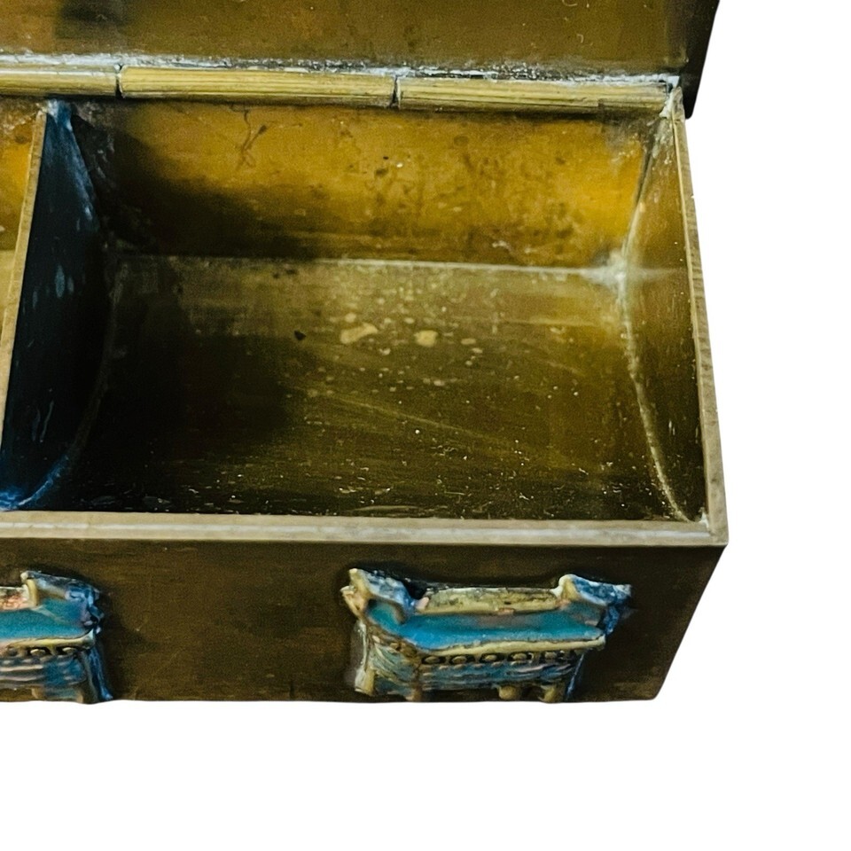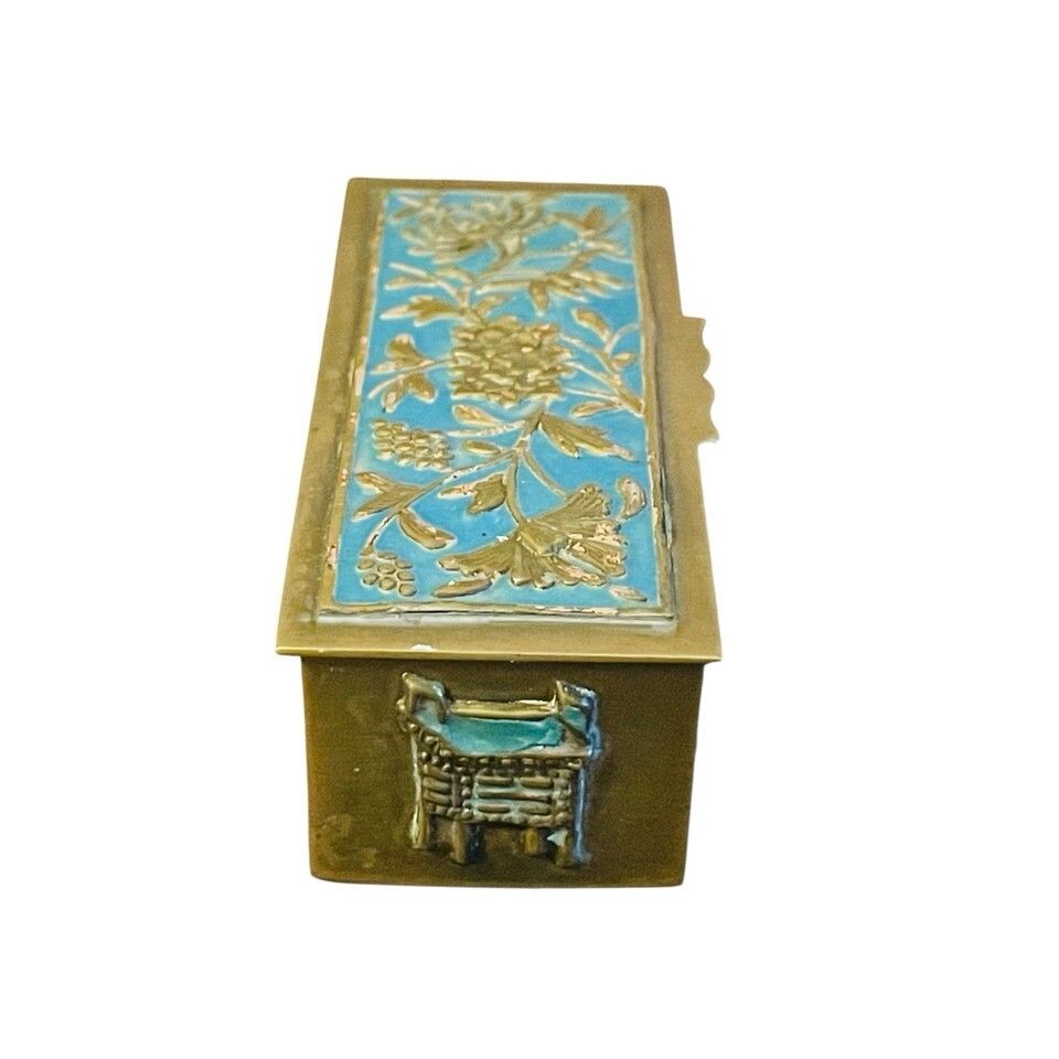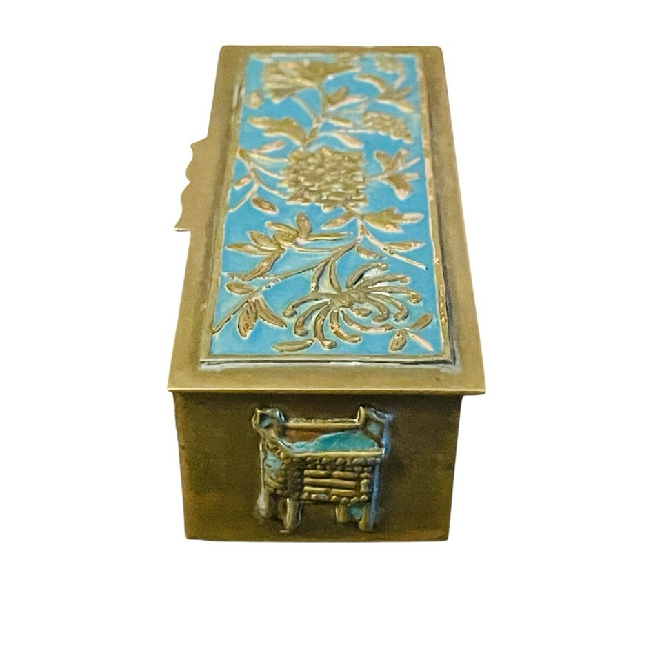 It's crafted from brass with cloisonne enamel, a technique involving metal wires creating compartments filled with colored enamel. The box in the image features intricate floral patterns on the lid and decorative artifact designs on the sides.