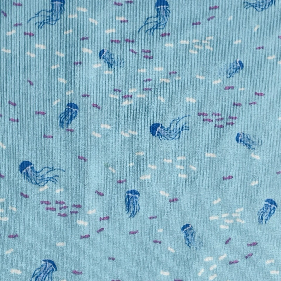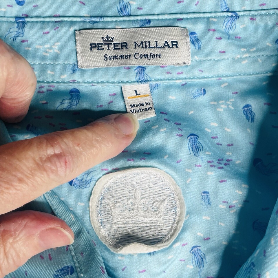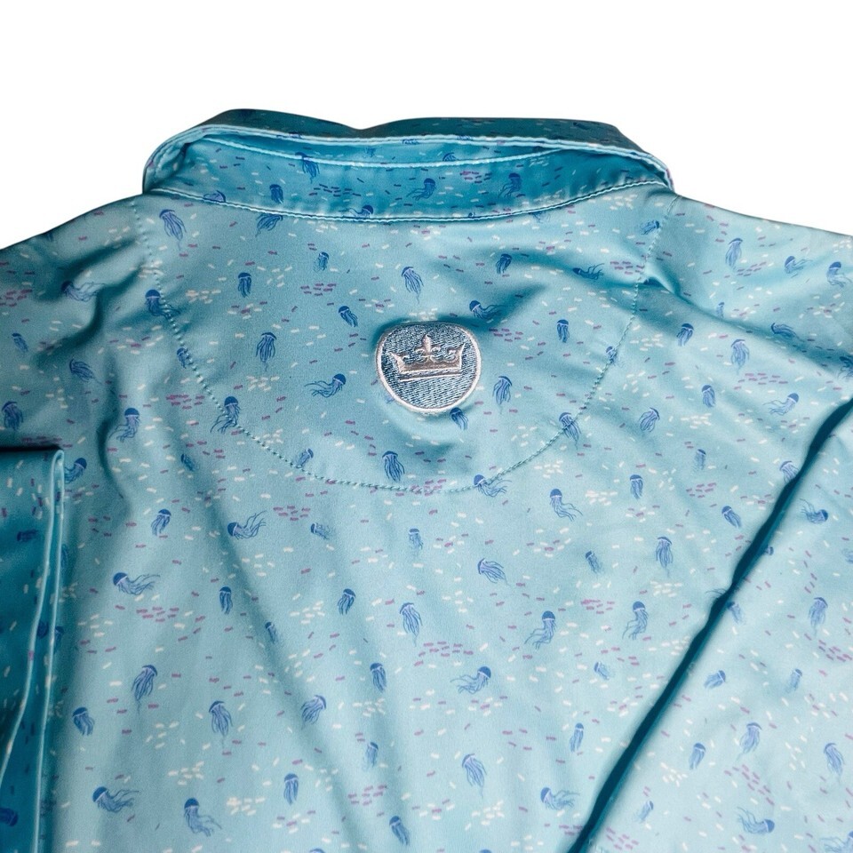 This Peter Millar Men's L Barstool Golf Club Jelly Fish Print Summer Comfort Polo features a collared neckline with a button closure and a button-down collar style. Made of lightweight and breathable knit fabric with a jellyfish pattern in blue, it is suitable for travel, activewear, and casual occasions during the summer season. The polo shirt is designed for a regular fit and offers stretch and comfort, making it ideal for activities like golf and fishing.