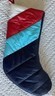 Cool looking parka style Wondershop Christmas stocking. Puffer style nylon exterior with diagonal stripes of red white and blue. Sherpa lined interior and red cord to hang.