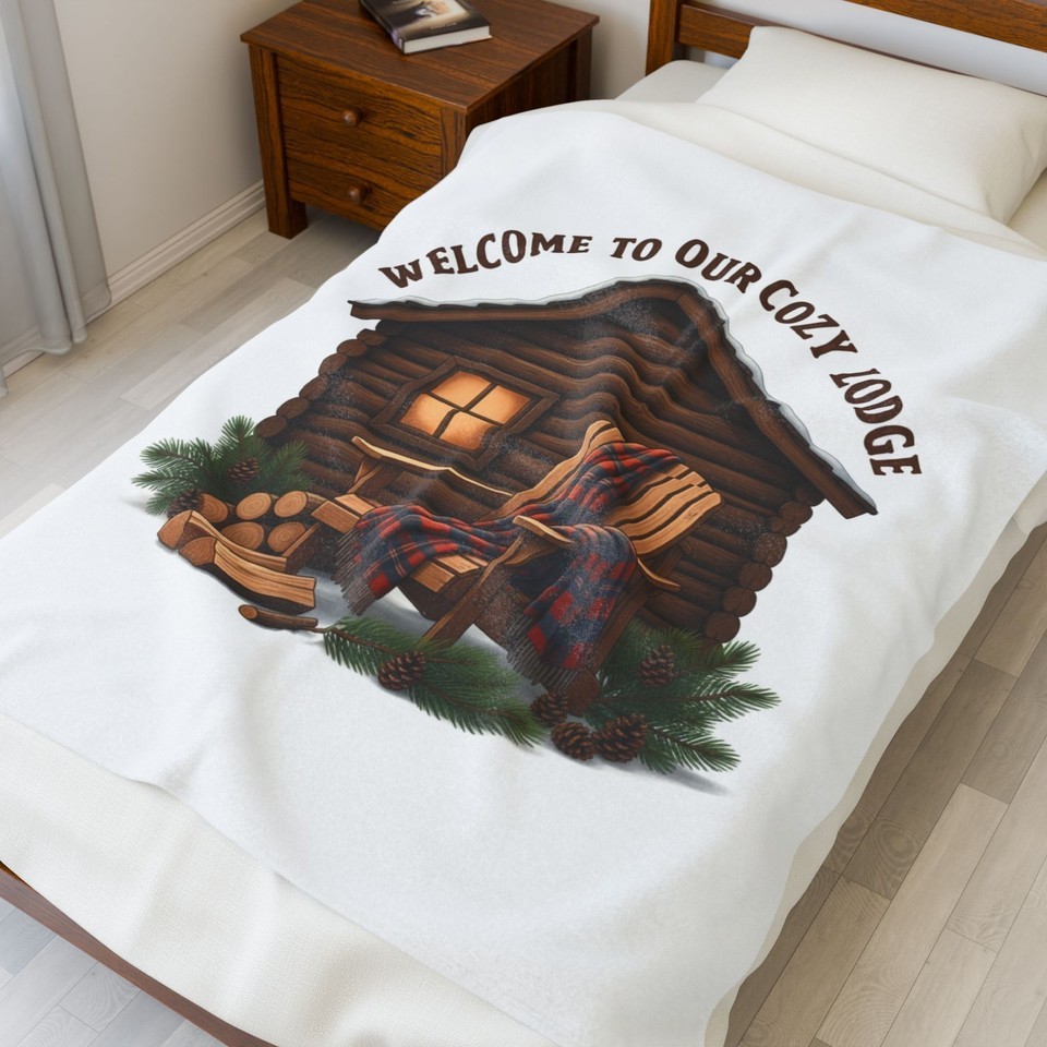 Welcome the lodge life into your living room with a plush velveteen blanket showcasing a log-cabin vignette?a stacked-firewood porch, a striped Adirondack chair draped in a warm throw, and pine sprigs under a rustic arched motto. The artwork uses cozy lodge motifs and a forest-neutral palette to evoke cabin vibes and apres-ski comfort; the single-sided print keeps the image crisp and detailed against a soft, velvety backdrop. This blanket reads as part of a cabin aesthetic collection for layering on sofas or draping over an armchair to add instant lodge warmth to everyday spaces.