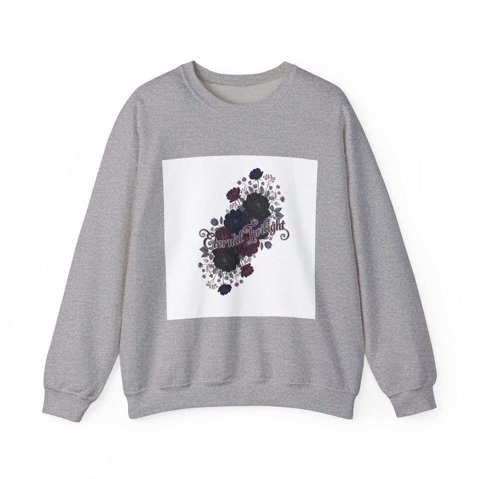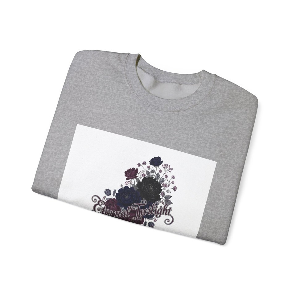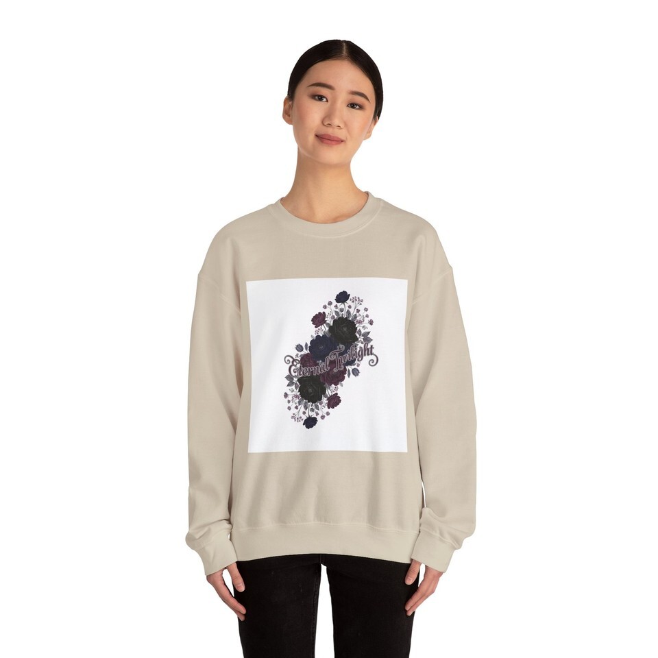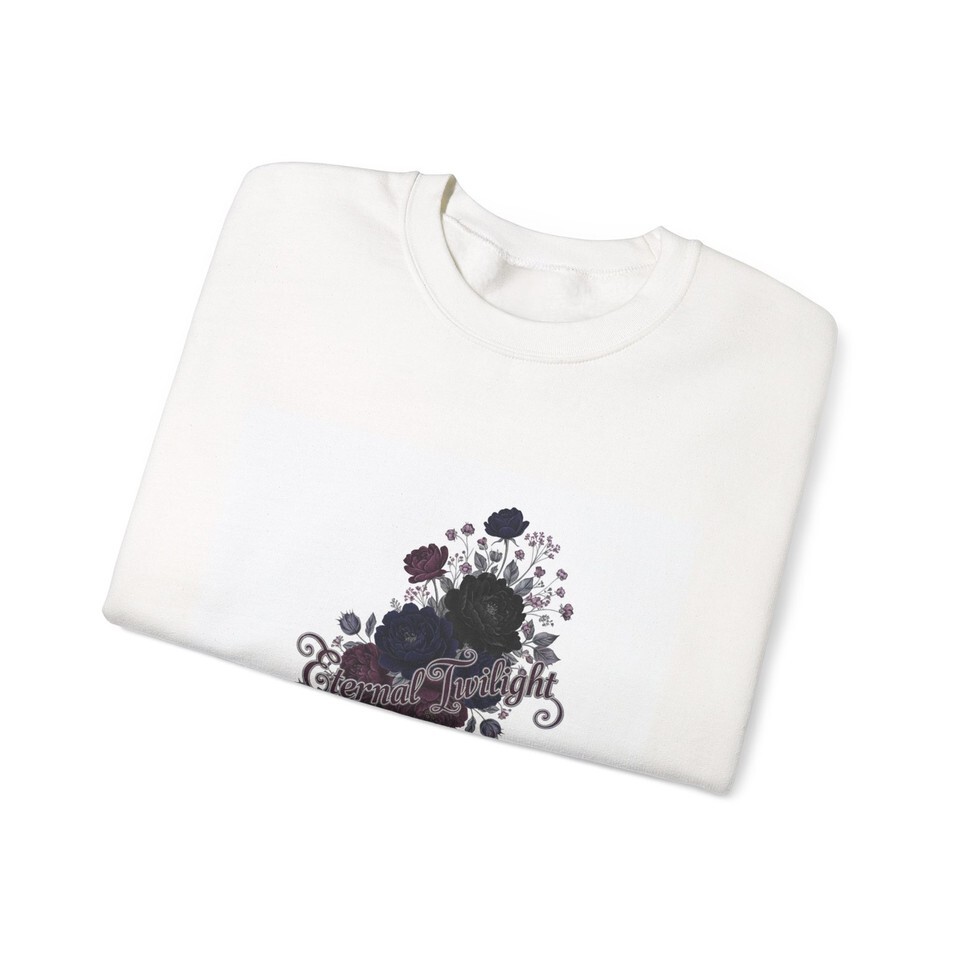 Dusty dark roses and delicate vines form a moody botanical cluster at the chest, blending soft gothic florals with a quiet, nocturnal palette. The subtle inked roses and muted plum highlights sit within an ornate, vintage-inspired silhouette that reads as romantic and slightly mysterious?a wearable nod to candlelit evenings and bookish alt style. The crewneck keeps the look grounded and easy to layer, making the design a low-key statement piece for colder months and dimly lit outfits.