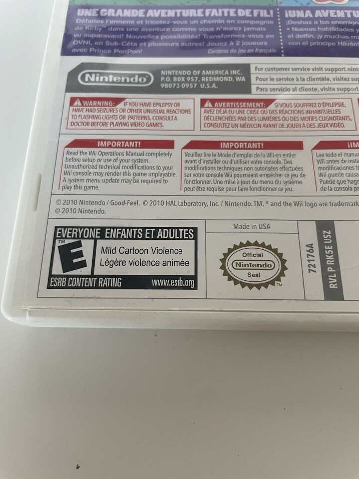 The product is a Nintendo Wii game called "Kirby's Epic Yarn", published by Nintendo Games. It is rated E for Everyone and includes a manual. This game offers players an engaging and creative experience as they navigate through various yarn-based levels and puzzles, all while collecting and using different yarn balls to solve challenges. With its charming graphics and engaging gameplay, Kirby's Epic Yarn is sure to provide hours of entertainment for players of all ages.