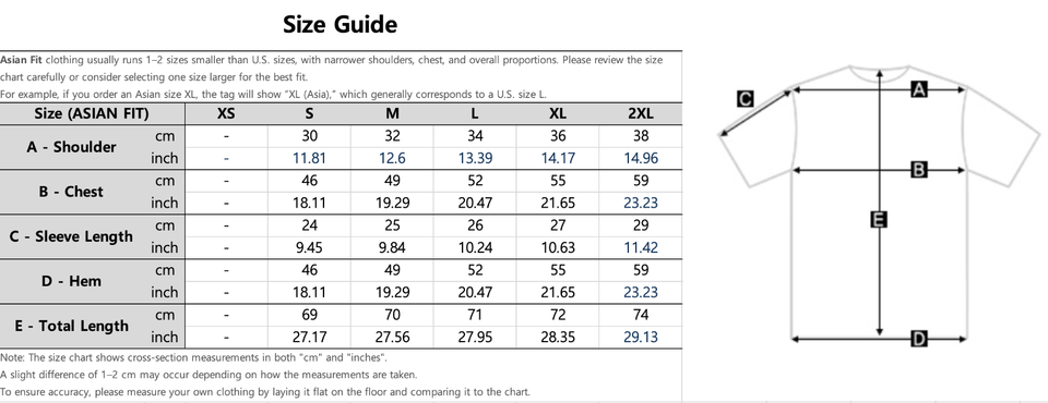 Asian Fit refers to clothing tailored for body shapes commonly found in Asian populations. These items typically run 1-2 sizes smaller than U.S. sizes, with narrower shoulders, chest, and overall proportions. Please check the size chart carefully or consider sizing up for the best fit.