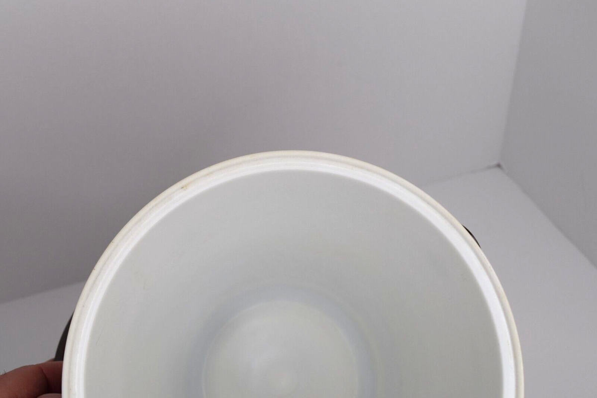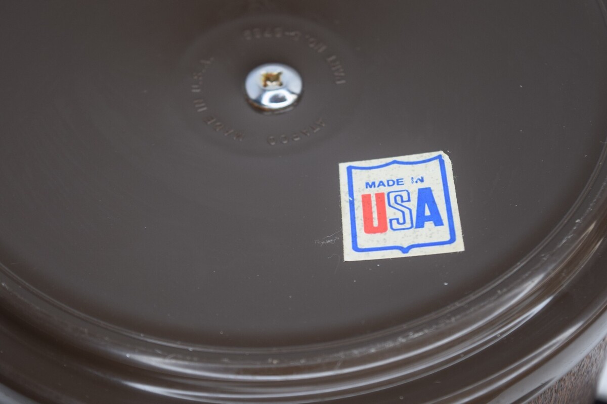 Vintage Atapco Plastic Woodgrain Ice Bucket Brown Made in USA 10" Tall. Pre-owned in good condition. Has some light signs of wear and use. Is dark brown wood grain with white trim and inside. A couple marks on the inside of the ice bucket. Has a small chip or imperfection on the edge of the lid. Lid sits on top, does not cover over like some of the other Atapco ice buckets. See all photos for details and condition. Will ship USPS Ground Advantage.