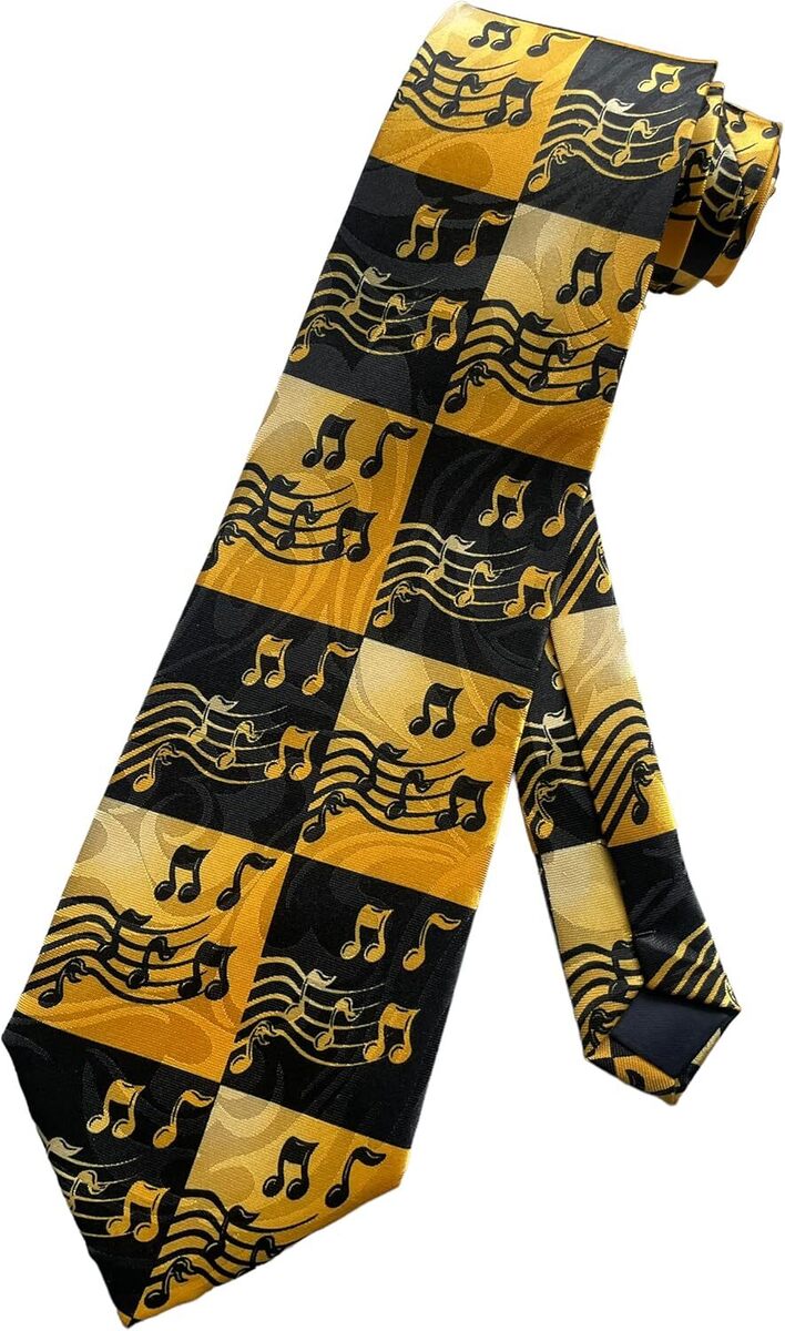 Tie depicts adorable, fun music notes and staffs on a large black and chrome yellow checkered gradient background.