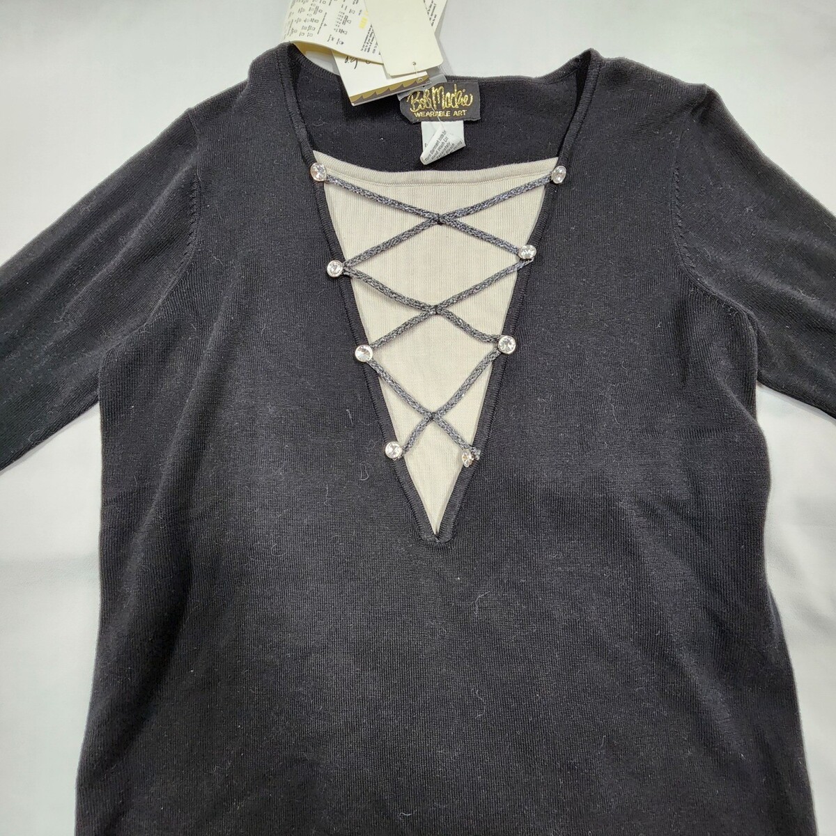 Keywords: Bob Mackie, Wearable Art, black sweater, lace up detail, crystal embellishments, long sleeve, knit top, evening wear, statement piece, designer knitwear, unique fashion, glamorous, artsy