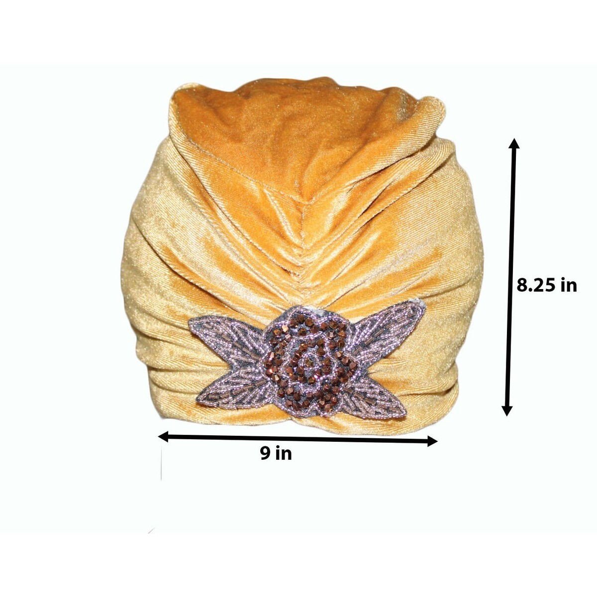Keywords: gold turban, velvet headwrap, embellished headwear, floral accent, beaded accessory, elegant headpiece, fashion turban, statement headwrap, special occasion, cultural fashion, festive headwear, party accessory