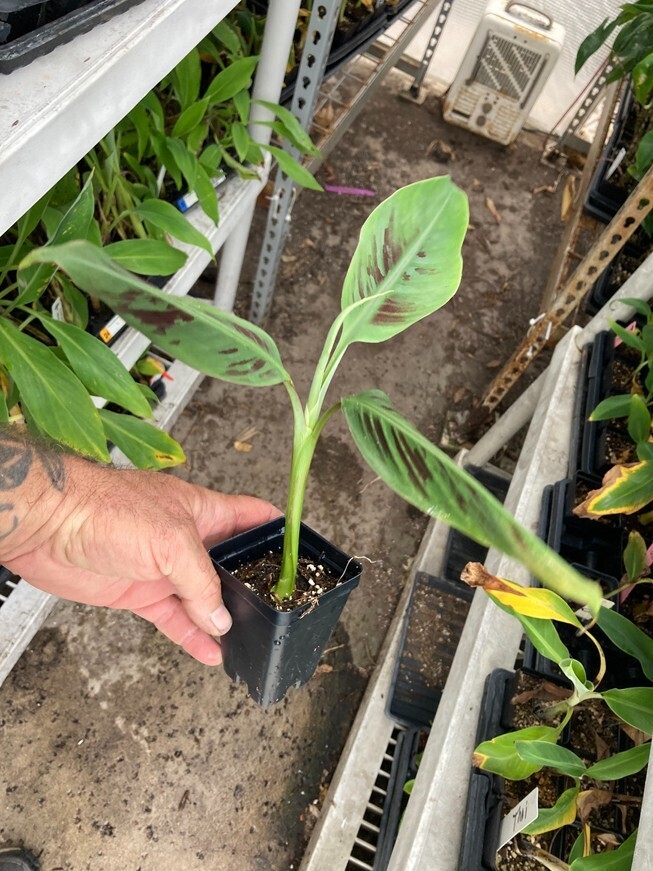 Musa sumatrana cross (Zebrina x Gran Nain) is a cross between Sumatrana Zebrina, (from which the colored leaves are derived) and Gran Nain(aka Chiquita), which is an edible banana ? giving an banana plant with striking foliage and edible fruit.