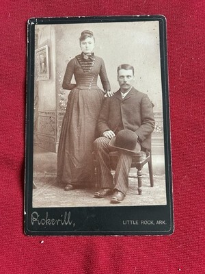 The product is an antique CDV photo featuring a handsome young couple from Little Rock, Arkansas. This original portrait measures 4.25 x 6.5 inches and is in sepia color, typical of early photographic formats. The photograph captures a classic American theme of family, husband, and wife, with the photographer identified as Pickerill. This unique and one-of-a-kind piece is from the late 19th century and embodies a bygone era of photographic history in the United States.