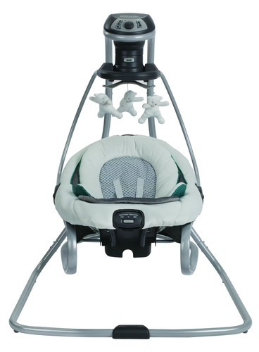 The Graco DuetSoothe Swing and Rocker features an ingenious seat that doubles as a portable rocker, giving you the flexibility to move around the house while keeping baby cozy and close by. In swing mode, 3 swinging directions and 6 speeds allow you to customize the swing to baby's preferences. With additional features including 2-speed vibration, an overhead toy mobile, and soothing songs and sounds, the Graco DuetSoothe? Swing and Rocker gives you even more options to keep baby content.