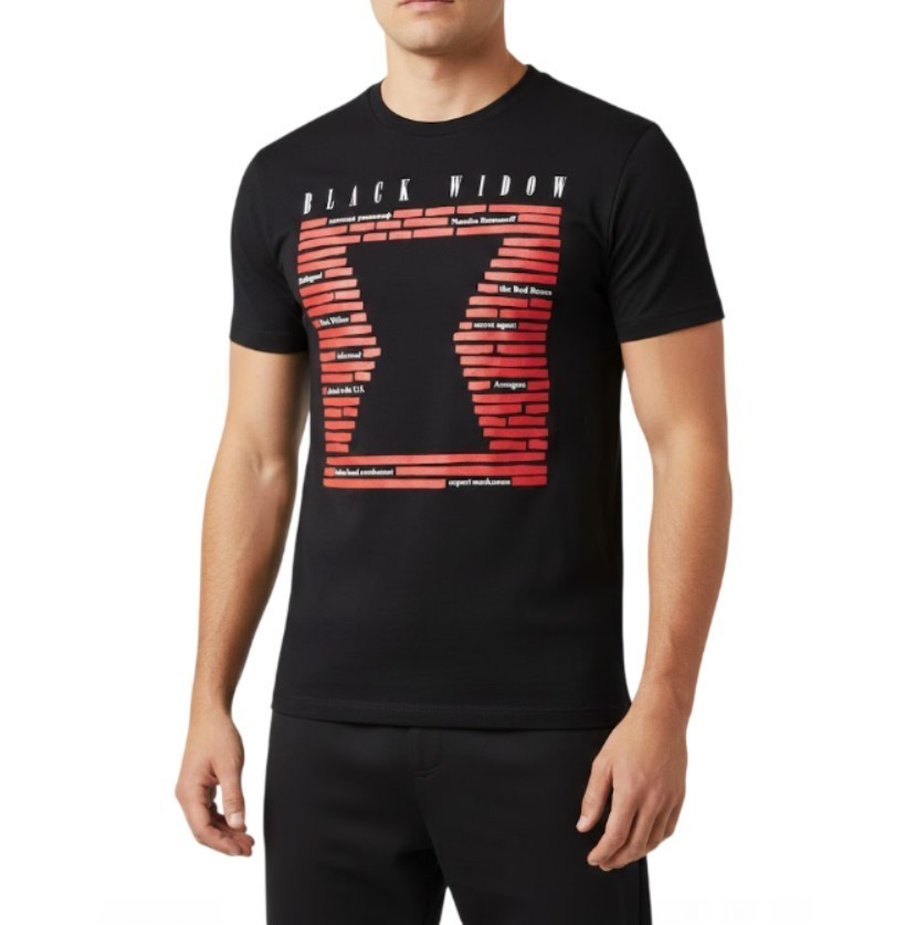 The shirt features a bold Black Widow graphic that adds an instant touch of action to your casual wardrobe. With a classic crew neck and short sleeves, it's a versatile piece that pairs seamlessly with jeans or shorts.