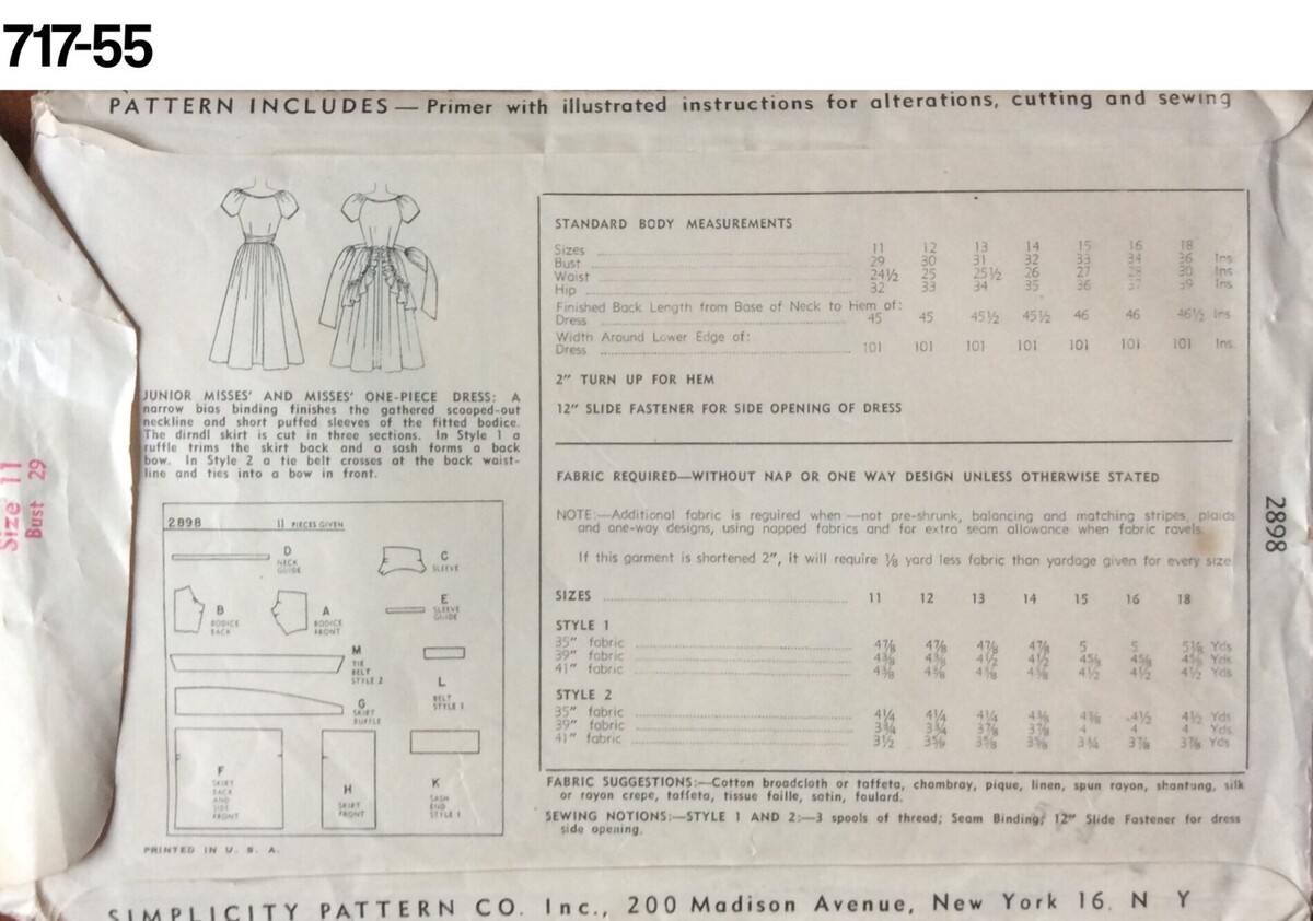 VTG Sewing Pattern Simplicity #2898 Size 11 Bust 29 Party Dress New Look 1949