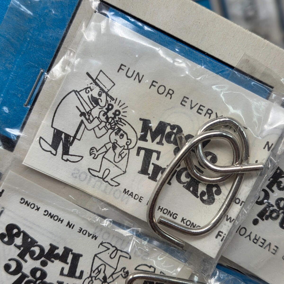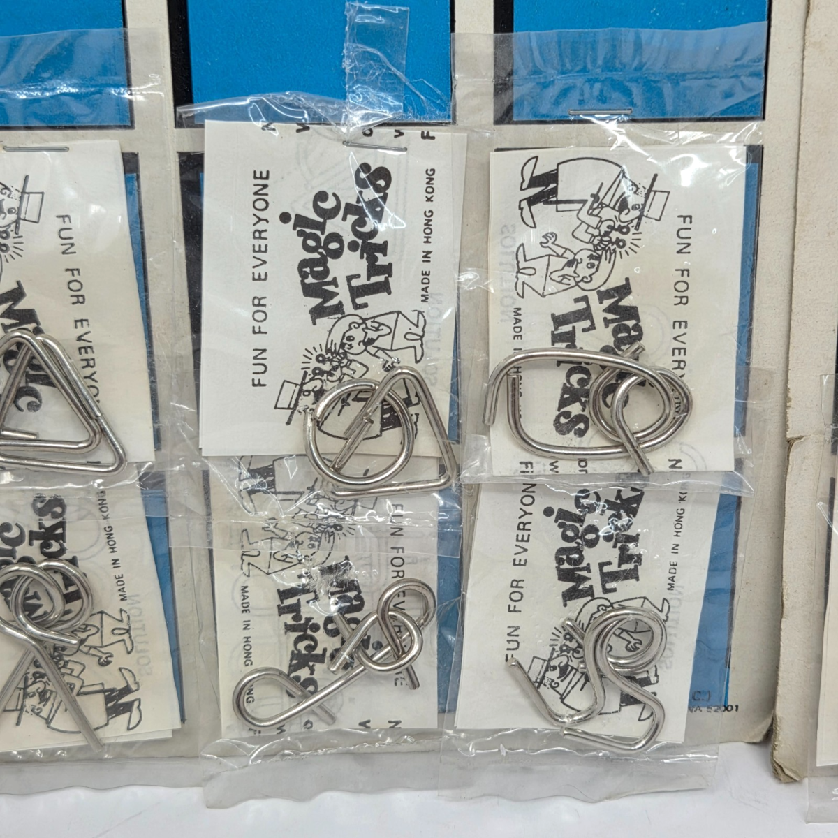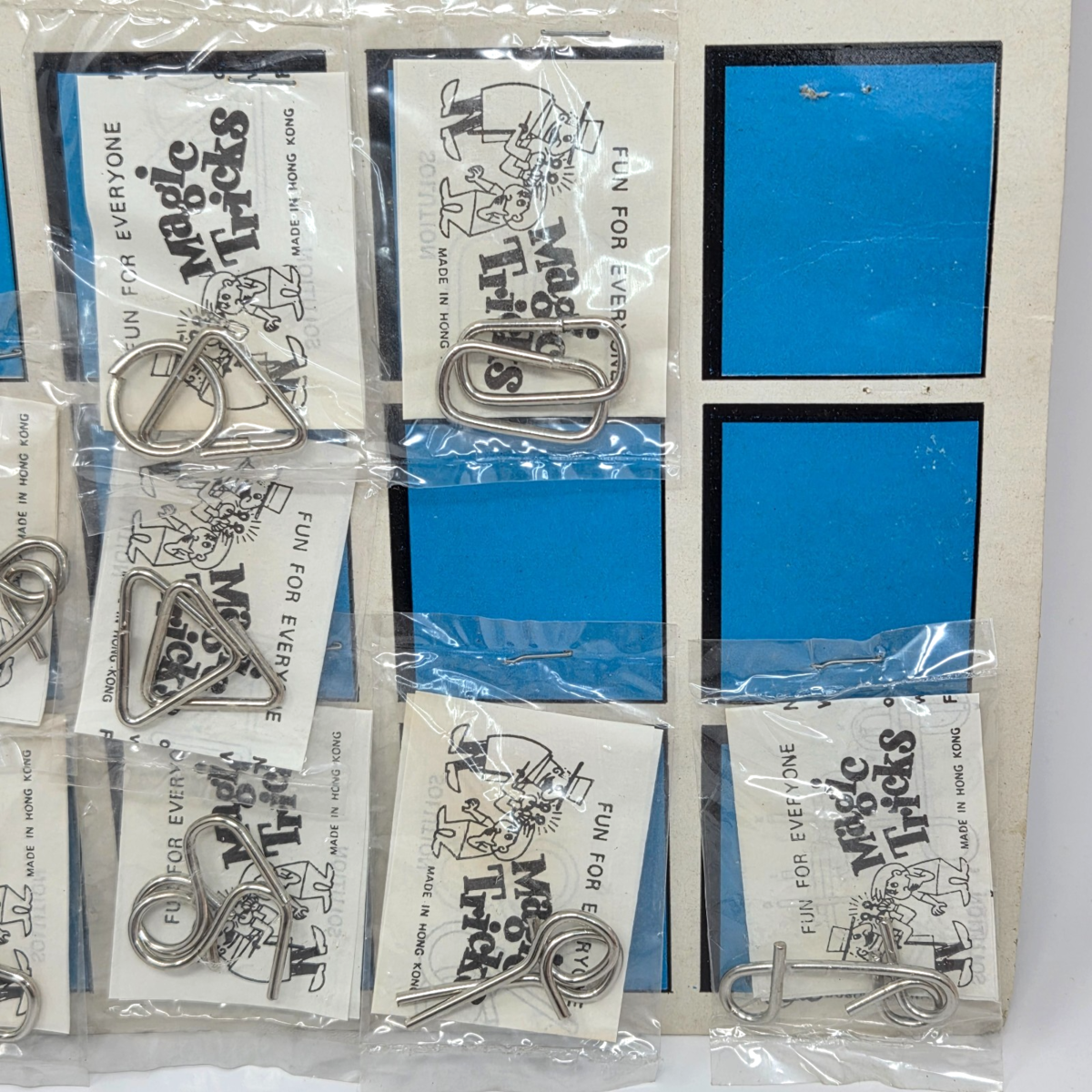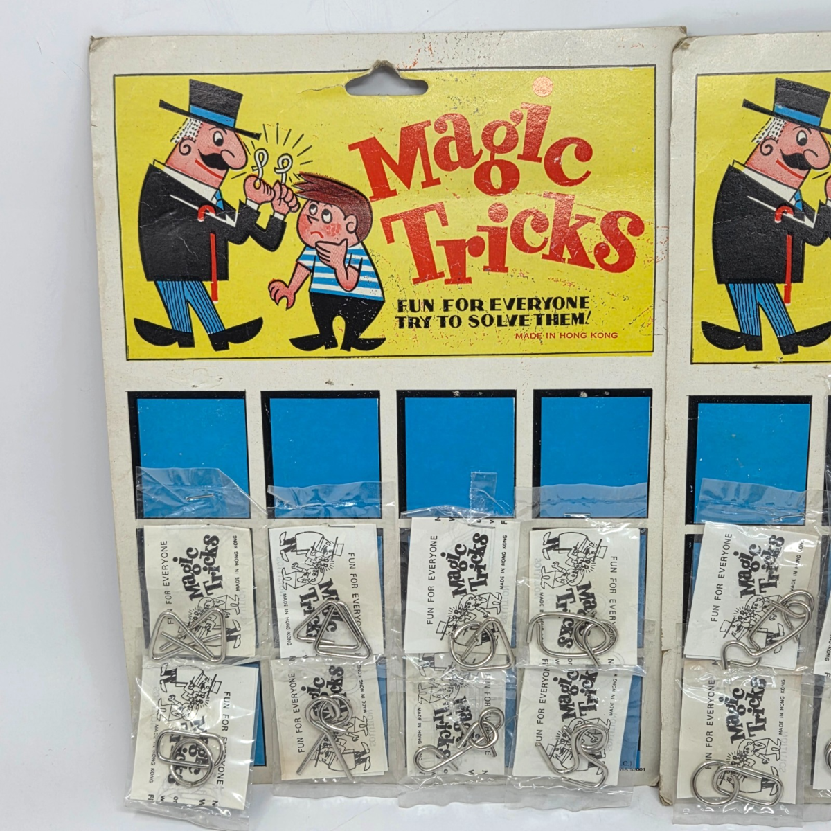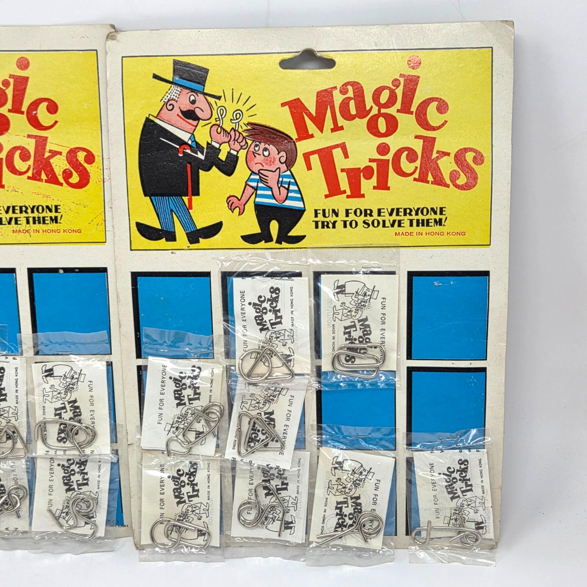 VINTAGE 1960's HONG KONG METAL MAGIC TRICKS 2 BOARDS W/ 8 SEALED BAGS EACH