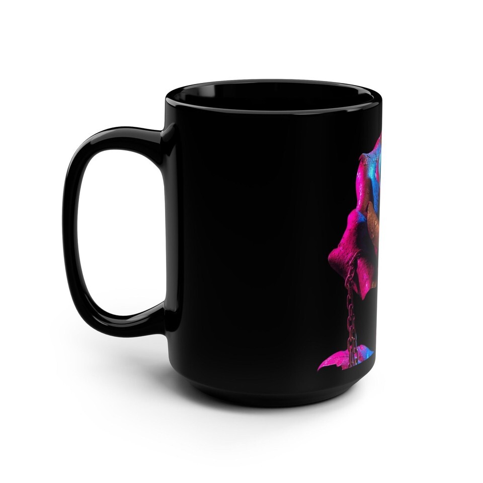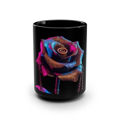 This 15oz black ceramic mug carries a moody, artful vibe ? a glossy midnight canvas that makes the neon-tinged rose artwork pop. Each sip becomes a small, cinematic moment: your coffee or tea framed by deep blacks and electric pinks and blues that catch the light. The comfortable C-shaped handle and generous volume keep your hands warm and your cup full through slow mornings, late-night sketch sessions, or while listening to a playlist that matches the mug?s edgy aesthetic. Built to handle daily use, it moves from microwave to dishwasher without losing its sheen, and its lead- and BPA-free glaze gives extra peace of mind.