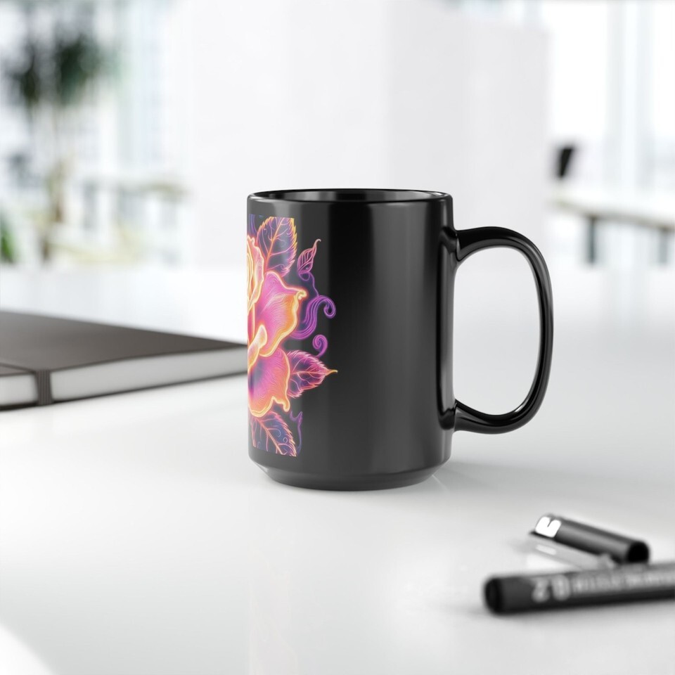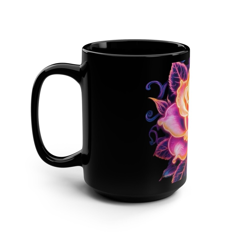 This glossy black 15oz mug carries a bold, neon-inspired rose that seems to glow against the deep ceramic. Warm pinks, oranges, and violets blend into a luminous bloom that wraps the cup, turning a morning coffee or late-night tea into a small, vivid ritual. The C-shaped handle feels familiar and secure. Durable and everyday-ready ? it warms quickly and cleans easily, keeping that electric floral art bright through regular use. The look suits someone who wants a little color and mood in their routine: a statement piece that still fits into a quiet kitchen or a cluttered desk of sketchbooks and paint smudges.