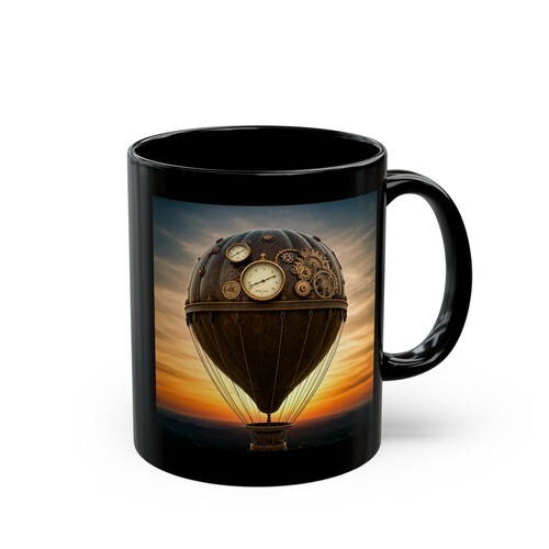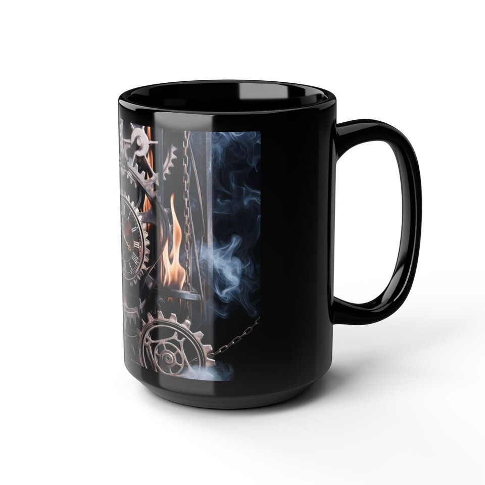 This 15oz black ceramic mug brings a touch of dark, mechanical drama to morning coffee and late-night brews. Intricate gears, ticking clock faces and drifting smoke weave together with licks of flame to create a steampunk-infused scene that feels lived-in and slightly rebellious. The glossy black finish deepens the contrast, letting the metallic tones and ember highlights stand out. Hold it by the comfortable C-shaped handle as you settle into a creative session, plan a cosplay outfit, or slow-sip tea while reading gothic fiction. Built for everyday use, it blends striking visuals with practical durability so the artwork is part of your ritual, not just on display.