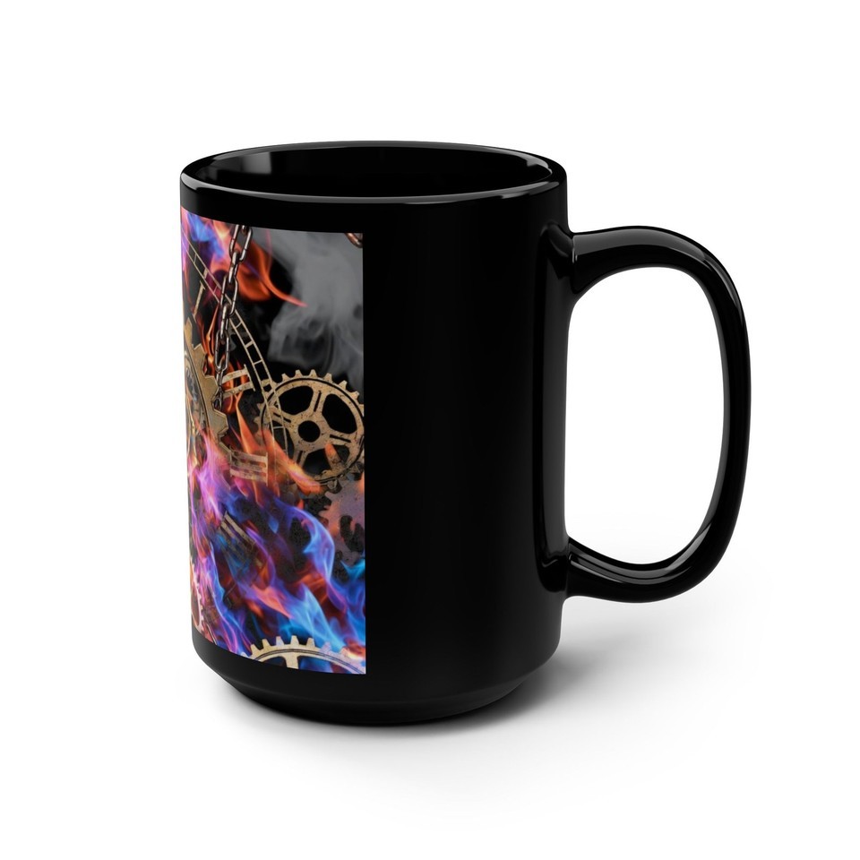 Fire Flames Burning Gears Clock Black Ceramic Mug 15oz Steampunk Chains
