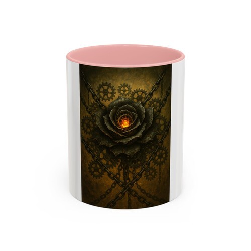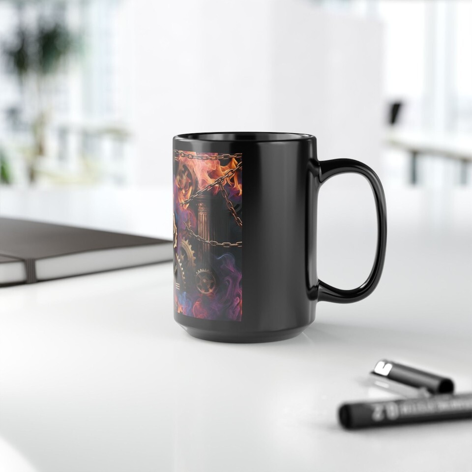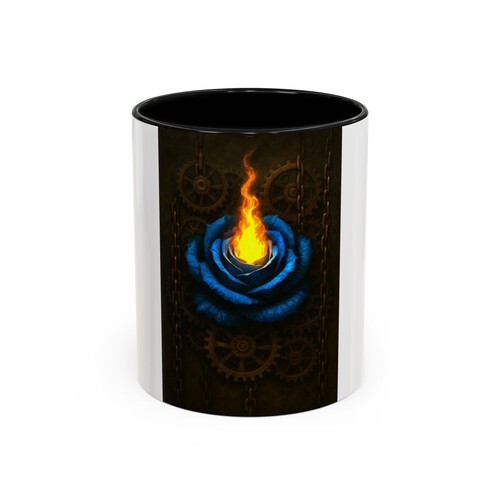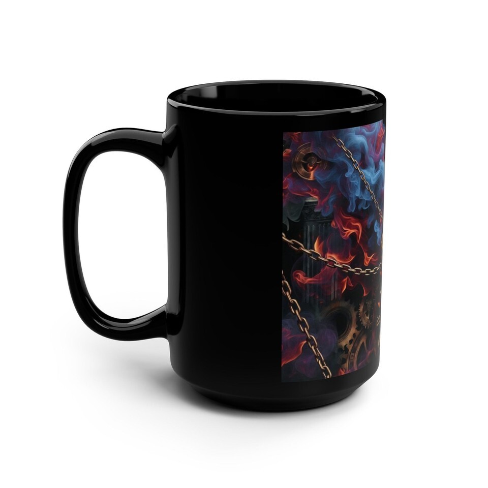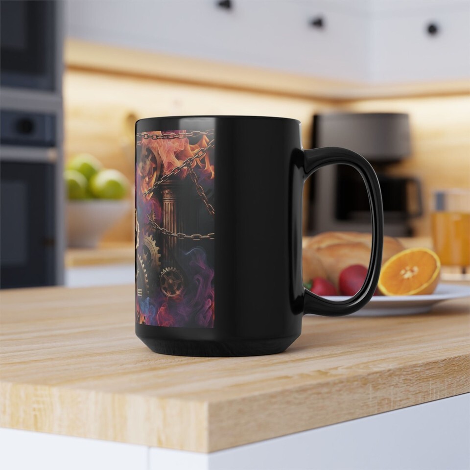 This 15oz black ceramic mug brings a touch of mechanical romance to the everyday. Rich, glossy black wraps around a vivid panel of smokey colors, brass gears, and a single rose threaded through clockwork ? a quiet collision of steam-era machinery and poetic flair. It feels like the kind of cup you reach for when you need a slow, deliberate moment: a hot coffee between morning tasks, a late-night tea while sketching, or a pause on the workbench. The comfortable C-handle and substantial weight give it a grounded, tactile presence; the image?s warm metallic tones glow against the deep black glaze. It?s built to be used: microwave- and dishwasher-safe, lead- and BPA-free, and compliant with standard ceramic safety guidelines.