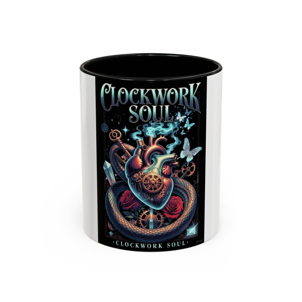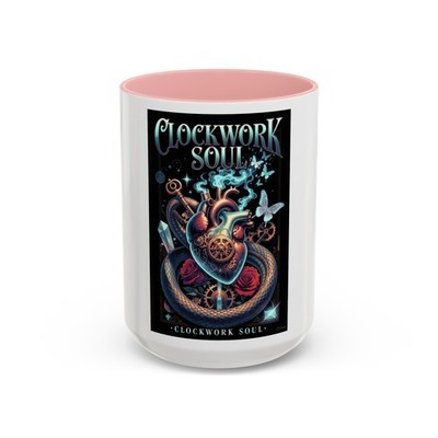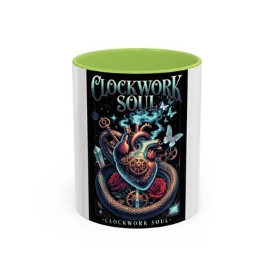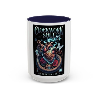 This ceramic accent mug brings a touch of steampunk romance to your morning ritual. A richly detailed illustration ? a clockwork heart entwined with gears, coils, and drifting moths ? wraps the front panel, glowing against a deep black backdrop. The colored interior and handle add a pop of contrast that echoes the art?s jewel tones. It feels like holding a small piece of storytelling: warm coffee in hand, you get a quiet moment to savor imagination and craft before the day begins.